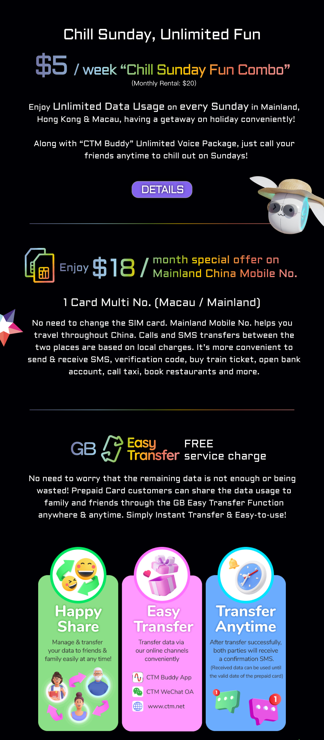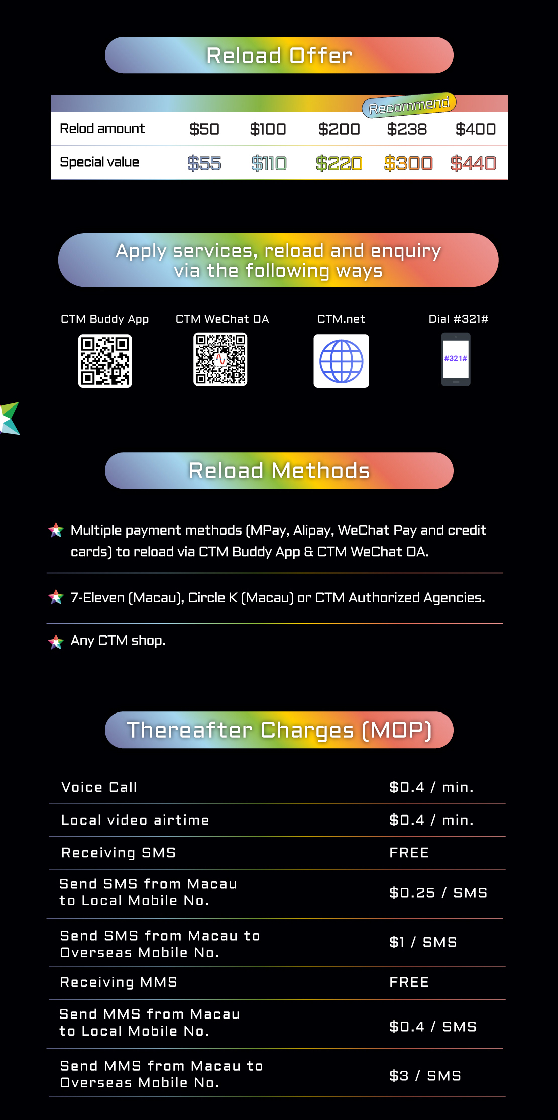 Notes: - Offer valid until 30 / 4 / 2026. - The "3 Destinations Data Usage without Expiry Date Plan" can be used until the prepaid card expiry date. - 1 Card Multi No. (Macau / China) Service offer period until 30 / 4 / 2026, and only applied to new application of this service. After offer period, the respective value-added service monthly offer rental ($28) will be applied if the customers agree to continue to use the service. - Based on the regulations, starting from 21 / 11 / 2025, each individual customer with Macau ID Card can register up to 6 prepaid cards, and holders of Macau Non-residents Worker’s Identification Card / other travel documents can register up to 3. Each institutional customer (excluding public entities) can register up to 25. If the registration quota is exceed, registration will be barred.Customers must present their original ID Card or valid Passport for registration upon purchasing the CTM Prepaid Card. Customers are responsible and liable for the correct and lawful use of their CTM Prepaid Card, and the customer shall be solely responsible for any liability arising therefrom. - After the prepaid card is activated, it will automatically apply for the “CTM Buddy” Unlimited Voice ($10) with validity period of 30 days, the related service charge will be deducted and renewed automatically from the prepaid card balance for every 30 days. - "CTM Buddy" Unlimited Voice refers to CTM Mobile Service postpaid / prepaid customers of local voice calls that are made & sent between CTM Mobile Service customers, and with Unlimited CTM Wi-Fi usage. - The receiving of SMS alert / SMS notification / SMS confirmation may delay due to network condition. The content of the SMS is for reference only, in case there is any discrepancy, the latest records of CTM shall prevail. - As stipulated by the Macau Government, customers must present their original ID Card or valid Passport for registration upon purchasing the CTM Prepaid Card. Customers are responsible and liable for the correct and lawful use of their CTM Prepaid Card, and the customer shall be solely responsible for any liability arising therefrom. - An SMS alert will be sent to customers when the residual balance of the CTM Prepaid Card is less than $30 or 1 day before the balance expiry date. - Customers need to purchase a new Prepaid Card if they wish to change the card type, and the residual balance and free usage of the previous Prepaid Card will not be transferred or credited to the new Prepaid Card. - The Mobile No. is randomly generated by the system and cannot be changed by customers. CTM Prepaid Cards do not support collect call service. - Lost or stolen cards must be reported immediately to CTM No. 1 Hotline 1000 for immediate cancellation. - If the CTM Prepaid Card is lost or damage, expires or becomes invalid for any reason, the card will not be replaced, the residual balance will not be refunded or transferred, and the mobile number will not be retained by customer. - The balance and the remaining usage in the Prepaid Card will not be returned after the Prepaid Card expired. - Customers can reload the card with a maximum value of $50,000. - This offer and latest prices are subject to change without prior notice. CTM reserves the right to change the approved tariff price, and customers will be informed through corresponding channels. - Customers acknowledge, understand, and expressly agree in accordance with the CTM Privacy Policy. - Based on CTM “Acceptable Use Policy (AUP)” and the “Provision of Mobile Service”. - This offer cannot be used in conjunction with any other promotional offers. - Customers are bound by the respective service agreement. - This offer price is subject to change without prior notice. - All prices are in MOP.
