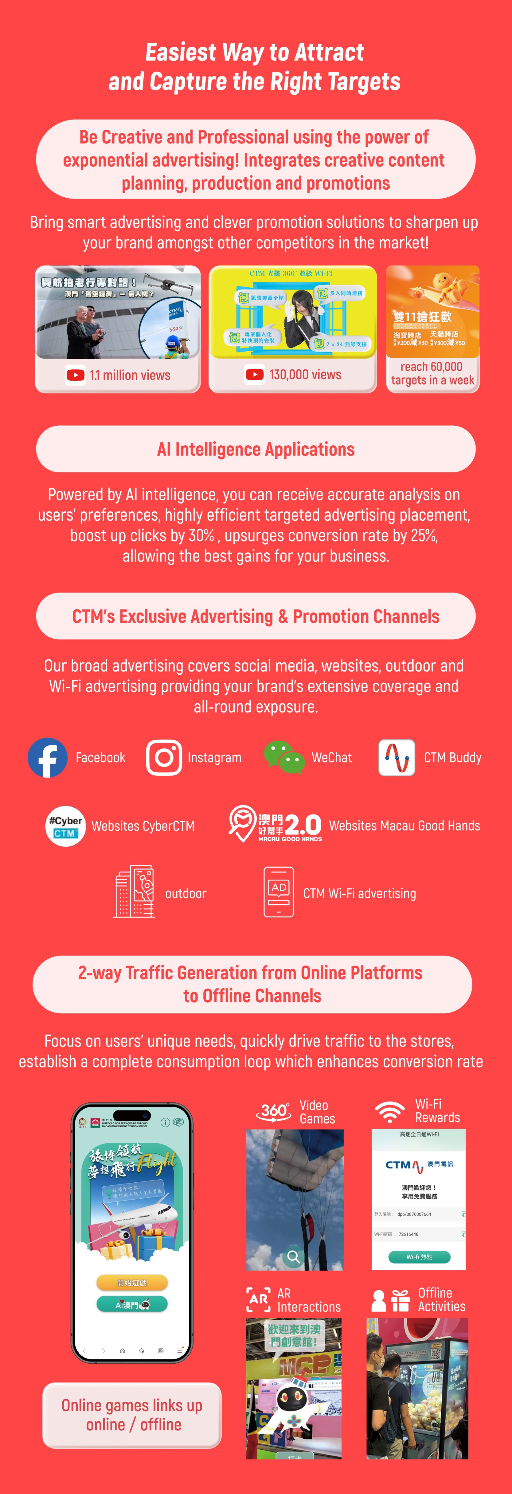 Note: - The offer is valid until 30 / 11 / 2025. - This offer price is subject to change without prior notice.. - All prices are in MOP. - The service is based on CTM Acceptable Use Policy "AUP". - Customers are bound by the respective service agreement. |