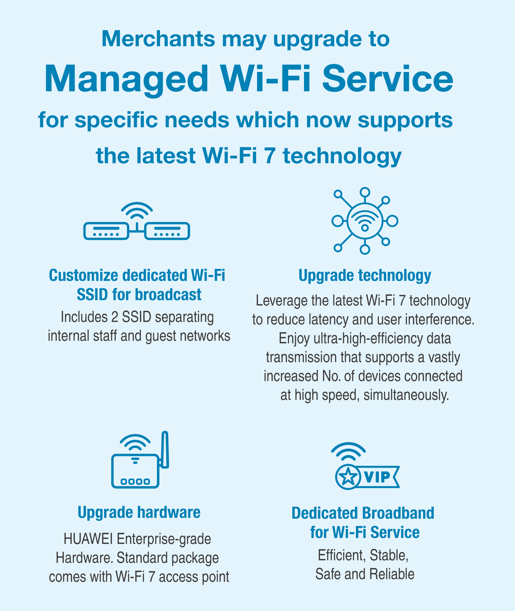 - CTM Business Wi-Fi can support up to Wi-Fi 7 tri-band technology, with a standard hardware Wi-Fi 7 dual-band access point. If customers requires higher performance, you may contact account manager for more information & quotation.