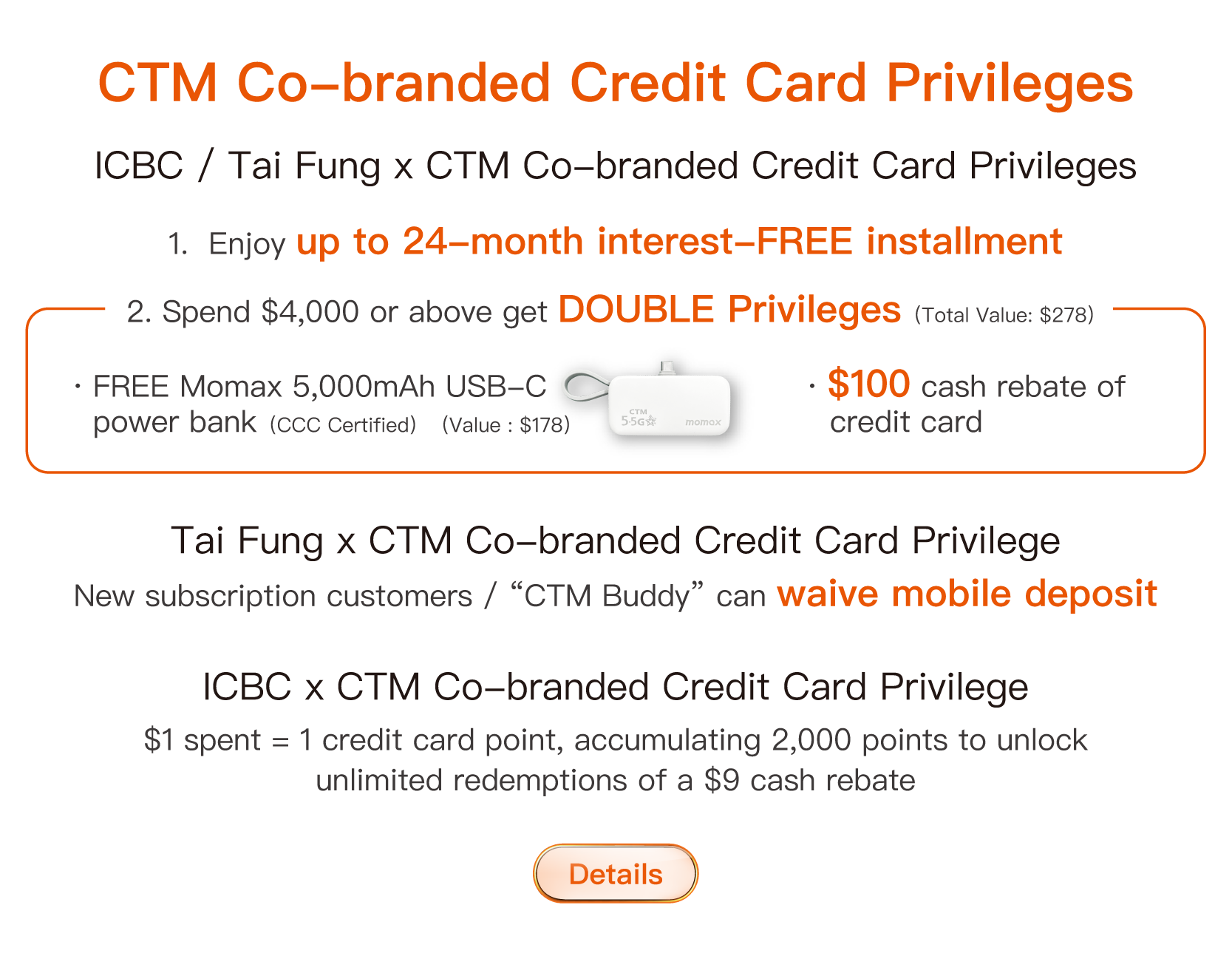 ⬥ Only applicable to ICBC / Tai Fung x CTM Co-branded Credit Card.
