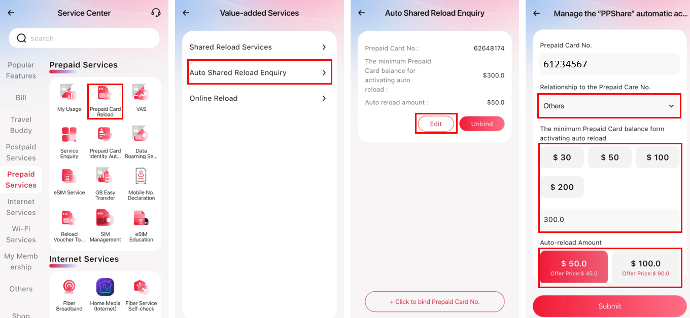 Log in → Auto Shared Reload Order enquiry → Click “Edit” to change Prepaid Card Mobile No. Auto Shared Reload setting → Select relationship with Prepaid Card Mobile No. , Auto Reload Trigger Amount and Auto Reload Amount → Submit