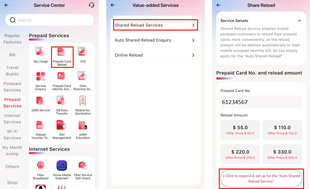 Auto Shared Reload Service enables mobile postpaid customers to bind prepaid cards for auto-reload automatically via the mobile postpaid account. Customers can more easily manage their prepaid cards