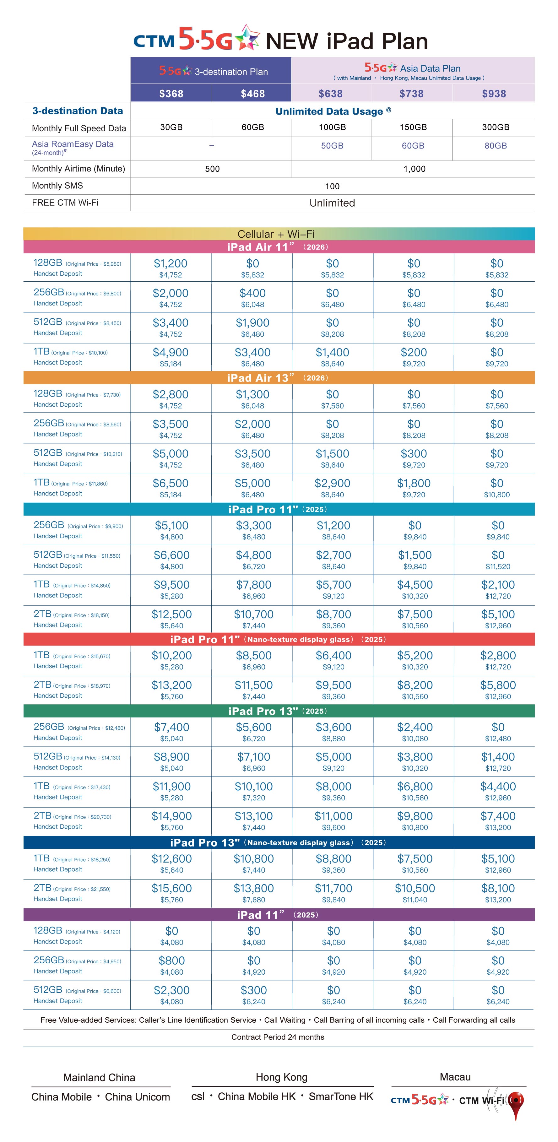 Notes : - The offer is valid until 31 / 3 / 2026. - The offer is only applicable to customers applying for a new mobile connection / port-in customer / those who are not currently bounded by other mobile service contracts. Customers are required to sign a mobile service contract with a 24-month. The above offer price is based on the monthly plan selected by the customer, and the relevant mobile communication service contract must be signed. .If customer suspends / terminates service, changes name or downgrades from the existing service plan within the contract period, the related deposit or waived amount will be charged automatically by proportion to customer’s mobile account, in addition, the related offer will be terminated immediately. After the promotion period, the respective original mobile service monthly rental / value added service will be charged automatically to the customer’s mobile account. - The activation time of 3-destinations Plan is after 8pm the following day. Customers are required to select “China Mobile HK”, “CSL” or “SmarTone HK” as mobile service operator when they are traveling in Hong Kong, as well as select "China Mobile" or "China Unicom" as mobile service operator when roaming in Mainland China. - " RoamEasy ” is only applicable to selected countries / destinations. - Customers are required to apply for the International Roaming Service in advance before applying for the “RoamEasy”. Customers are required to select specific roaming network operator in order to enjoy this roaming data offer (highly recommend customer to select the network “manually” at handset device); otherwise, an additional roaming data usage will be charged base on the charging scheme of the selected roaming network operators. If customers have activated the “ Mobile Data Access Barring Service " or their data service is bar by the “ Local Data Usage Auto-Suspension Service ”, they can deactivate the barring to continue to enjoy the Roaming Data Service. - When 3-destinations Monthly Plan customer apply Roaming Data Package, the data usage used in Mainland China & Hong Kong will be counted into the related Share Data Usage in Monthly Plan, thus will not deduct the data usage in Roaming Data Package. - All prices are in MOP. Customers of the above promotions are bound by the respective service agreement. This offer cannot be used in conjunction with any other promotional offers. This offer price is subject to change without prior notice. All products and gifts are only available while stock lasts. The above services are based on CTM Acceptable Use Policy " AUP ".