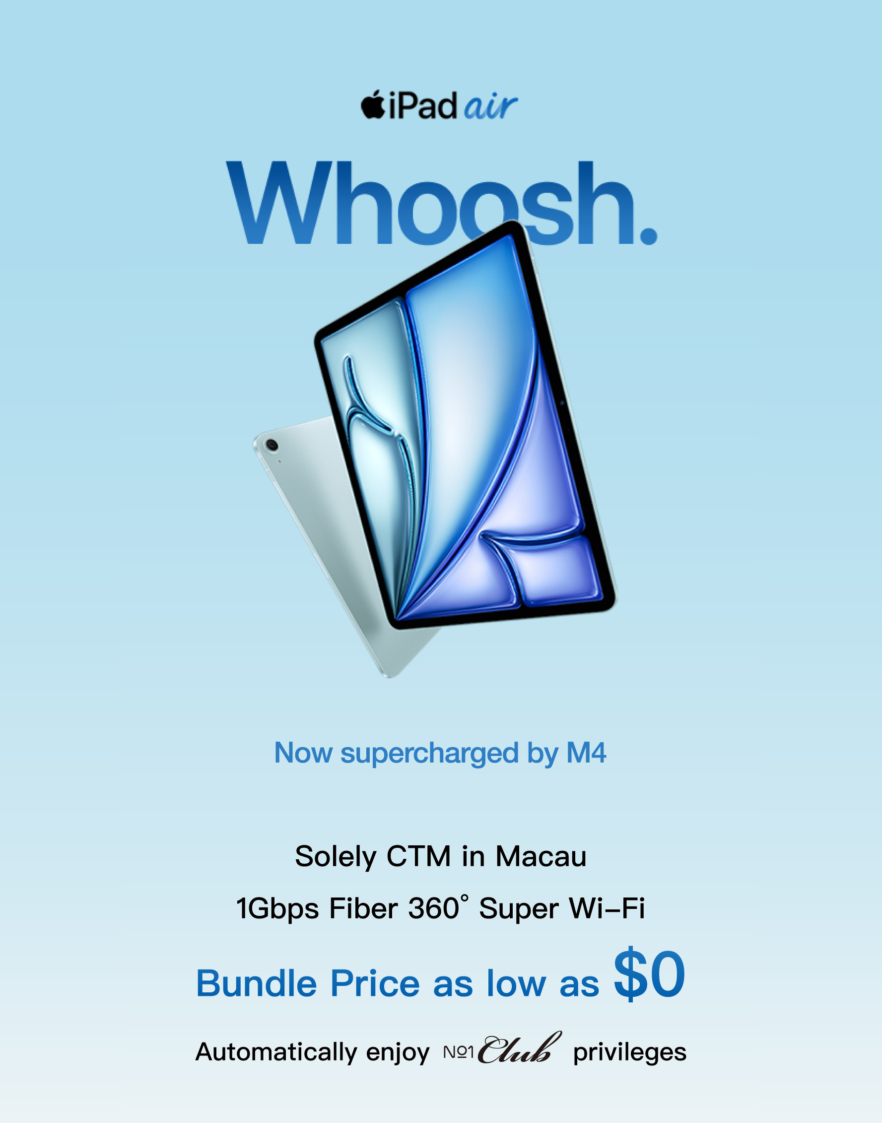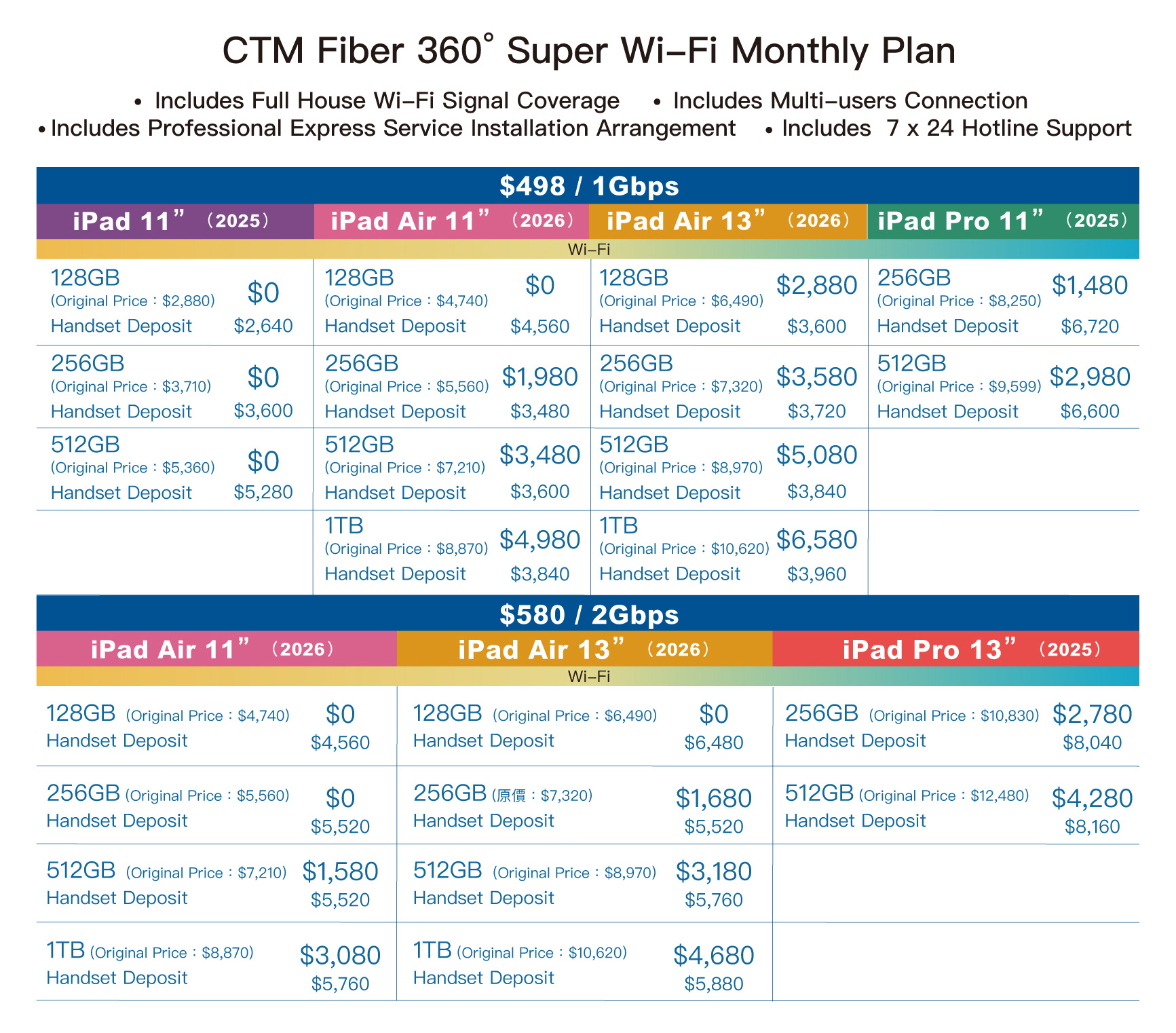 Notes : - The offer is valid until 31 / 3 / 2026. - The offer is only applicable to customers applying for a new fiber connection or those who are not currently bounded by other fiber service contracts. - Customers are required to sign a 24-month contract. - If the customers terminate Internet service or downgrade from the existing service plan within contract period, the related deposit will be charged automatically to the customer's Internet account. In addition, the related offer will be terminated immediately. - This offer price is subject to change without prior notice. - All prices are in MOP. - The offer is bound by the related terms and conditions. The service is based on CTM Acceptable Use Policy "AUP".