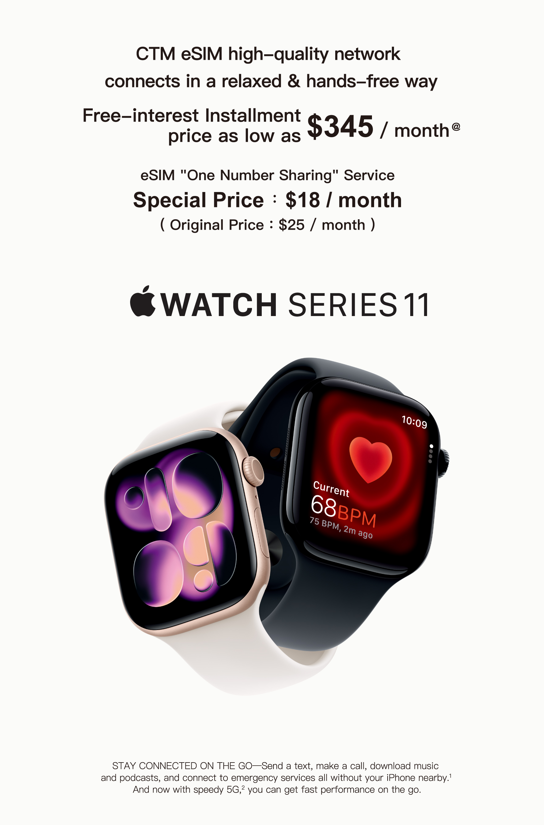 Notes: This offer is valid until 31 / 12 / 2025. Using eSIM "One Number Sharing" Service, the Apple Watch shares the Mobile No. and Monthly Plan with your phone, the usages will be deducted from the Mobile Plan; Using eSIM "Family" Number Plan,You can assign an independent number to the Apple Watch, and enjoy separate voice, data and SMS usage from the "Family" Number Plan. Customers are bound by the respective service agreement. This offer cannot be used in conjunction with any other promotional offers. This offer price is subject to change without prior notice. All products and gifts are available while stock lasts. All prices are in MOP. The service is based on CTM Acceptable Use Policy "AUP".