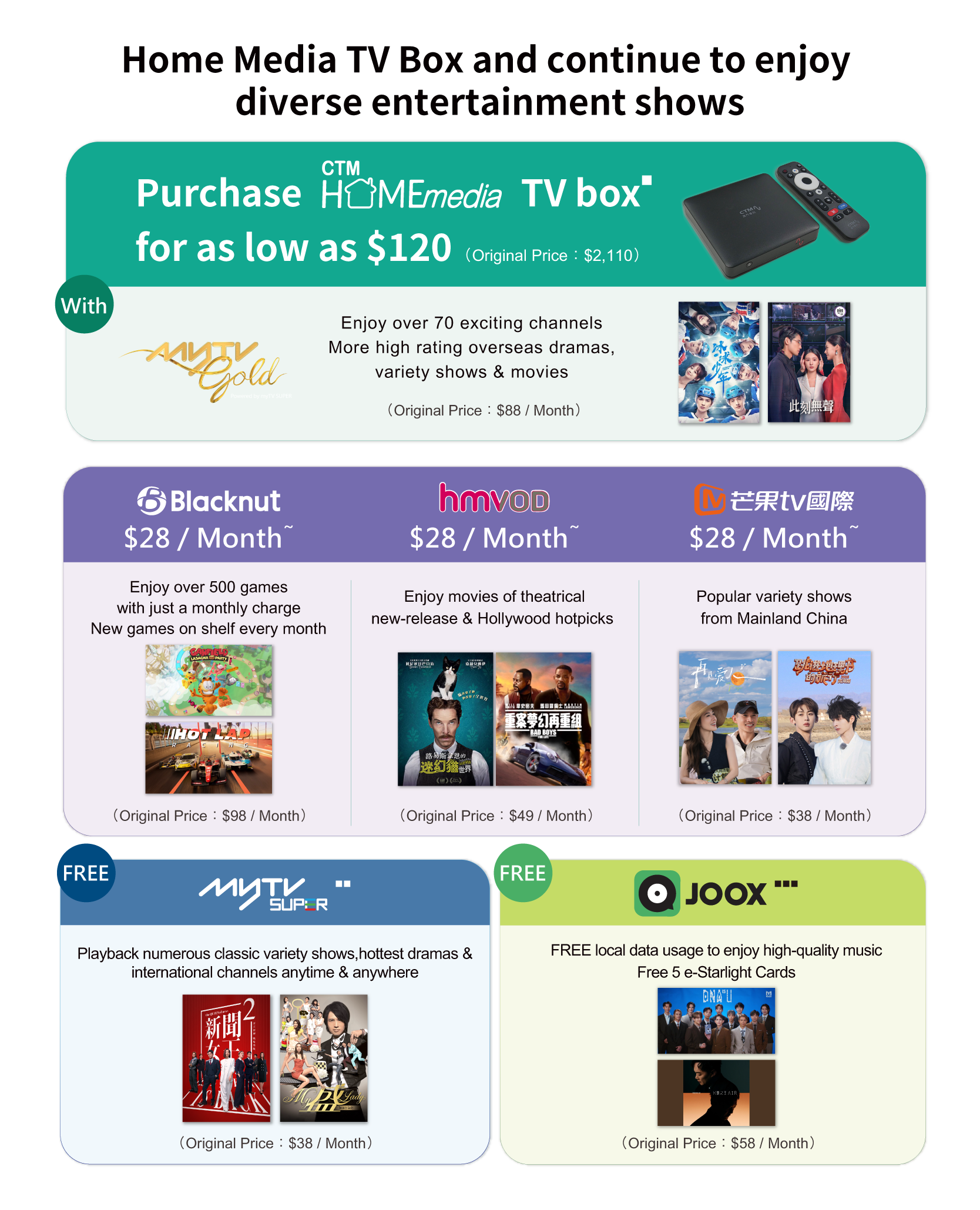 ▪ This offer is only applicable to customers who newly subscribed myTV Gold service. Mobile Plan / Home Fiber Broadband customers can enjoy offer price $120 to purchase Home Media TV box with 12-month myTV Gold service (1 TV Box version / Smart TV version + Apps for 2 devices / web). After the promotional period, if customers continue to use myTV Gold service, an offer price of $58 / month (Original Price: $88 / month) will be charged. Each Mobile Plan / Home Fiber Broadband customer can enjoy this offer once.