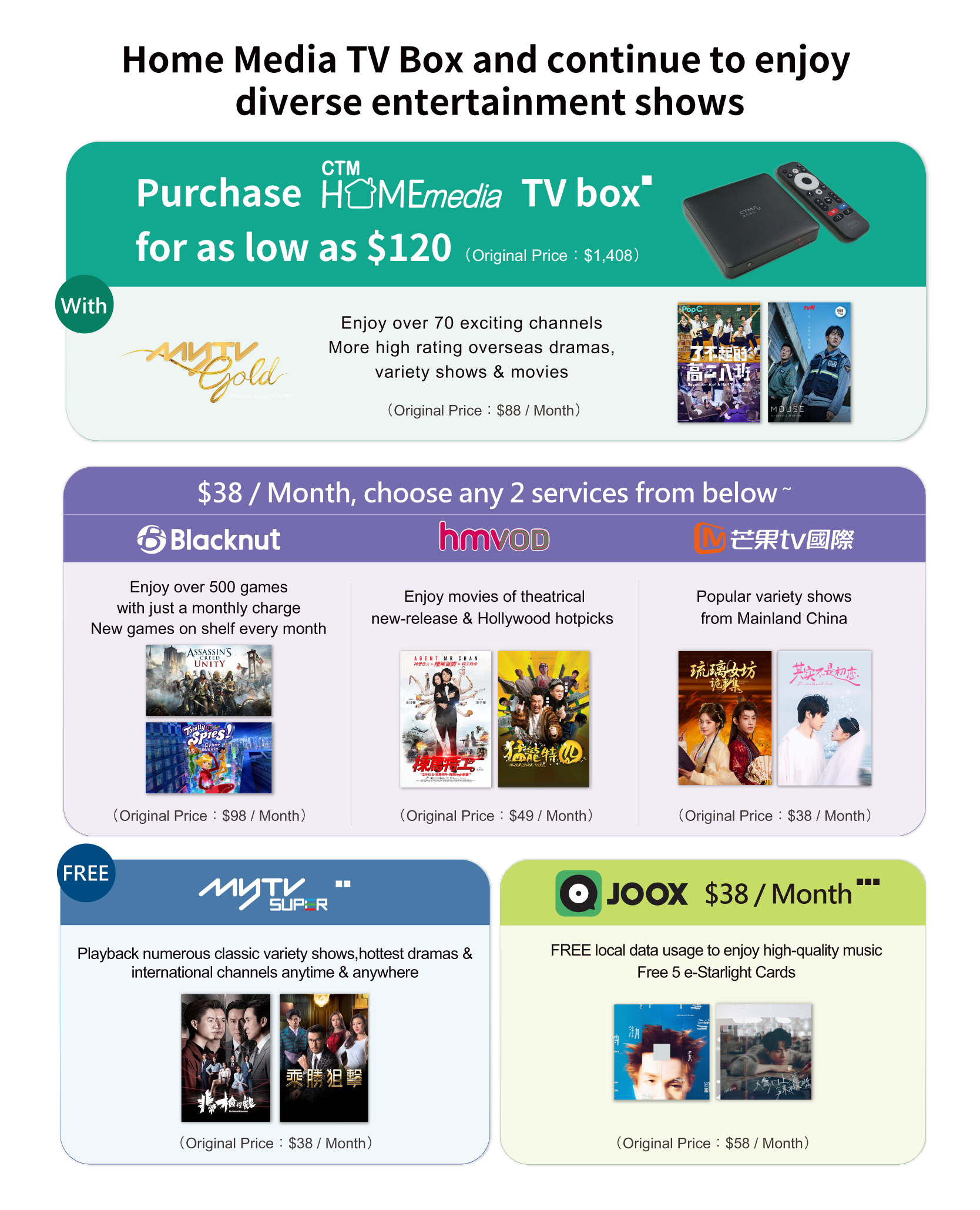 ▪ This offer is only applicable to customers who newly subscribed Home Media Content service – myTV Gold service. Mobile Plan / Home Fiber Broadband customers can enjoy offer price $120 to purchase Home Media TV box with 6-month Home Media Content service – myTV Gold service (1 TV Box version / Smart TV version + Apps for 2 devices / web). After the promotional period, if customers continue to use the related service, an offer price of $58 / month (Original Price: $88 / month) will be charged to customer's bill account automatically. Each Mobile Plan / Home Fiber Broadband customer can enjoy this offer once.