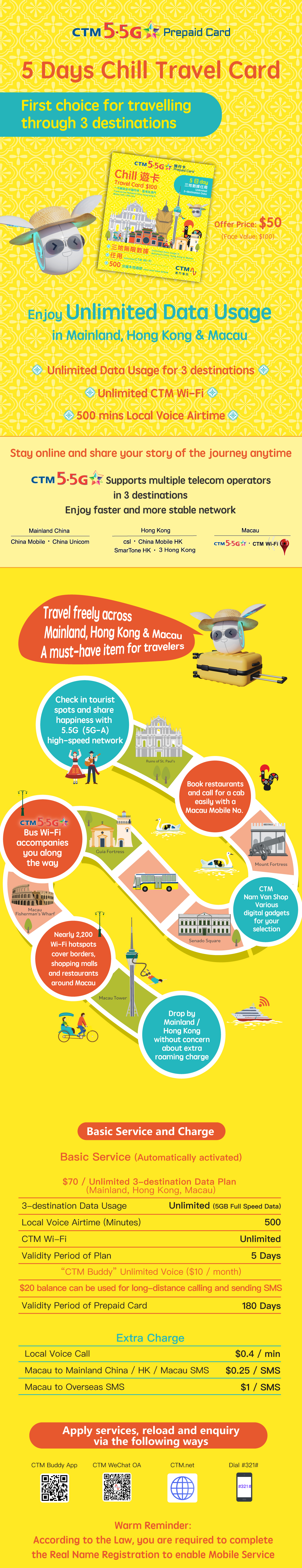 - The stored value of this Prepaid Card is $100. After the Prepaid Card is activated, it will automatically apply for the “5-day Unlimited 3-destination Data Plan” ($70) and “CTM Buddy” Unlimited Voice ($10 / month). Customer can enjoy the service after completing the Real Name Registration. The “5-day Unlimited 3-destination Data Plan” includes unlimited data usage in Mainland China, Hong Kong & Macau (5GB full speed data), 500 minutes local voice airtime that is valid for 5 days. If customers reload the Prepaid Card during the validity period, the corresponding amount will be deducted and the period will be extended.
