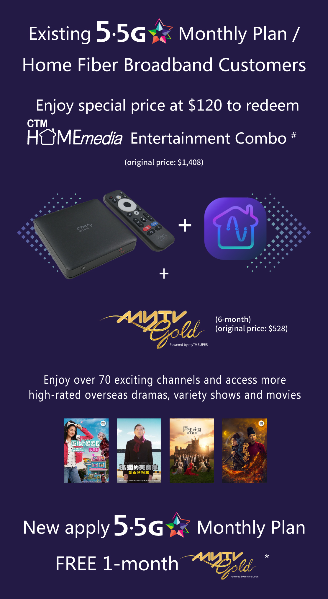 # This offer is only applicable to customers who newly subscribed Home Media Content service – myTV Gold service. Mobile Plan / Home Fiber Broadband customers can enjoy offer price $120 to purchase Home Media TV box with 6-month Home Media Content Service – myTV Gold service (1 TV Box version / Smart TV version + Apps for 2 devices / web) before 31 / 5 / 2026. After the promotional period, if customers continue to use the related service, an offer price of $58 / month (Original Price: $88 / month) will be charged to customer's bill account automatically. Each Mobile Plan / Home Fiber Broadband customer can enjoy this offer once.