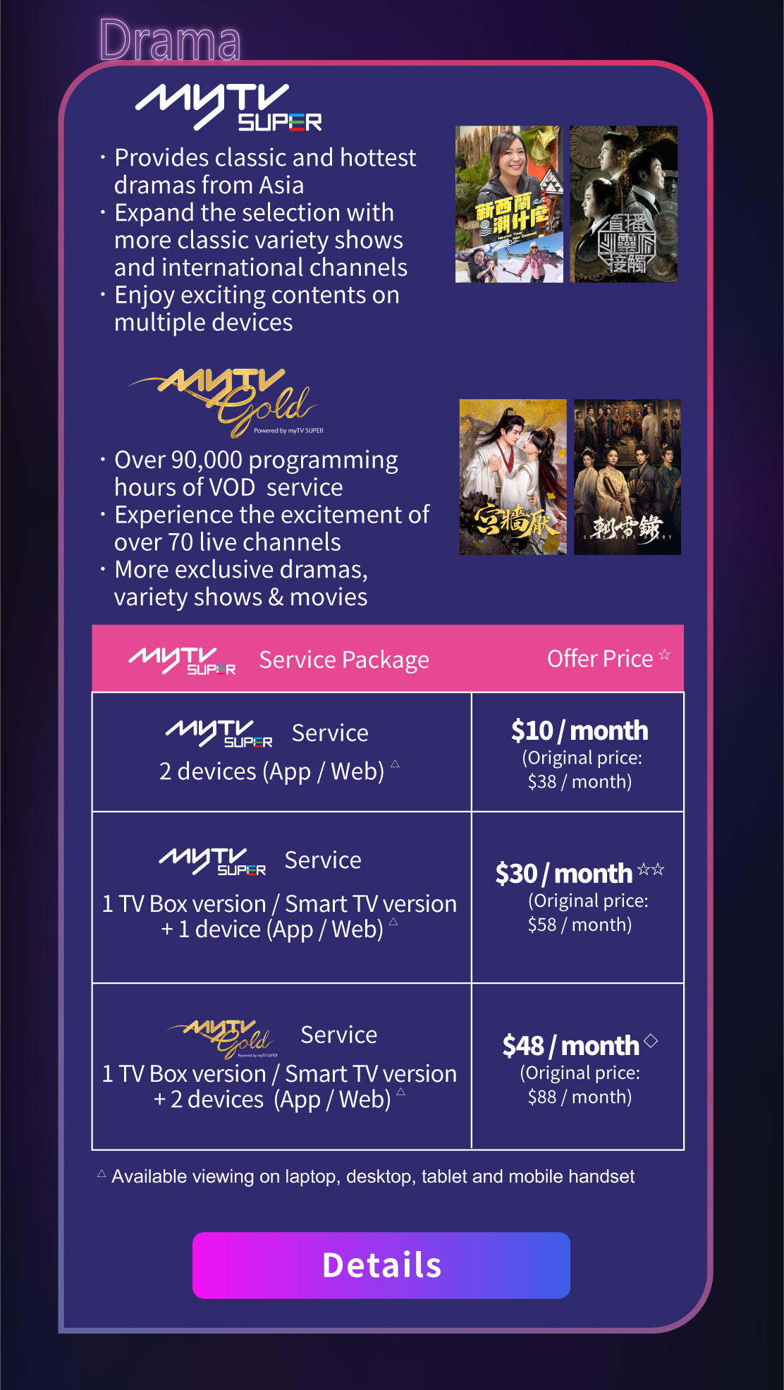 ◇ Customers can enjoy special price $48 / month to upgrade to myTV Gold Service (1 TV Box version / Smart TV version + 2 devices for App / Web). After the 12 months promotion period, original offer price $58 will be charged if customers continue to use the service (original price: $88 / month).
