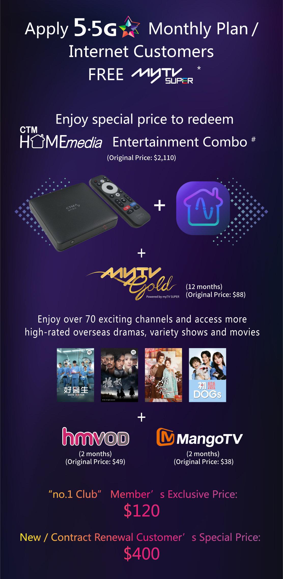 # This offer is only applicable to customers who are newly subscribing to myTV Gold, hmvod, and Mango TV services. Existing "no.1 Club" members can enjoy an exclusive price of $120 for purchasing Home Media TV box with 12-month myTV Gold service (1 TV Box version / Smart TV version + Apps for 2 devices / web), 2-month of hmvod service (Original Price: $49 / month) and 2-month Mango TV service (Original Price: $38 / month); Non "no.1 Club" members can purchase the above services at the offer price of $400. After the promotion period, if customers continue to use myTV Gold service, an offer price of $58 / month (Original Price: $88 / month) will be charged; if customers continue to use hmvod and Mango TV services, a combo price of $48 / month will be charged. Each mobile / Internet account can enjoy this offer once.