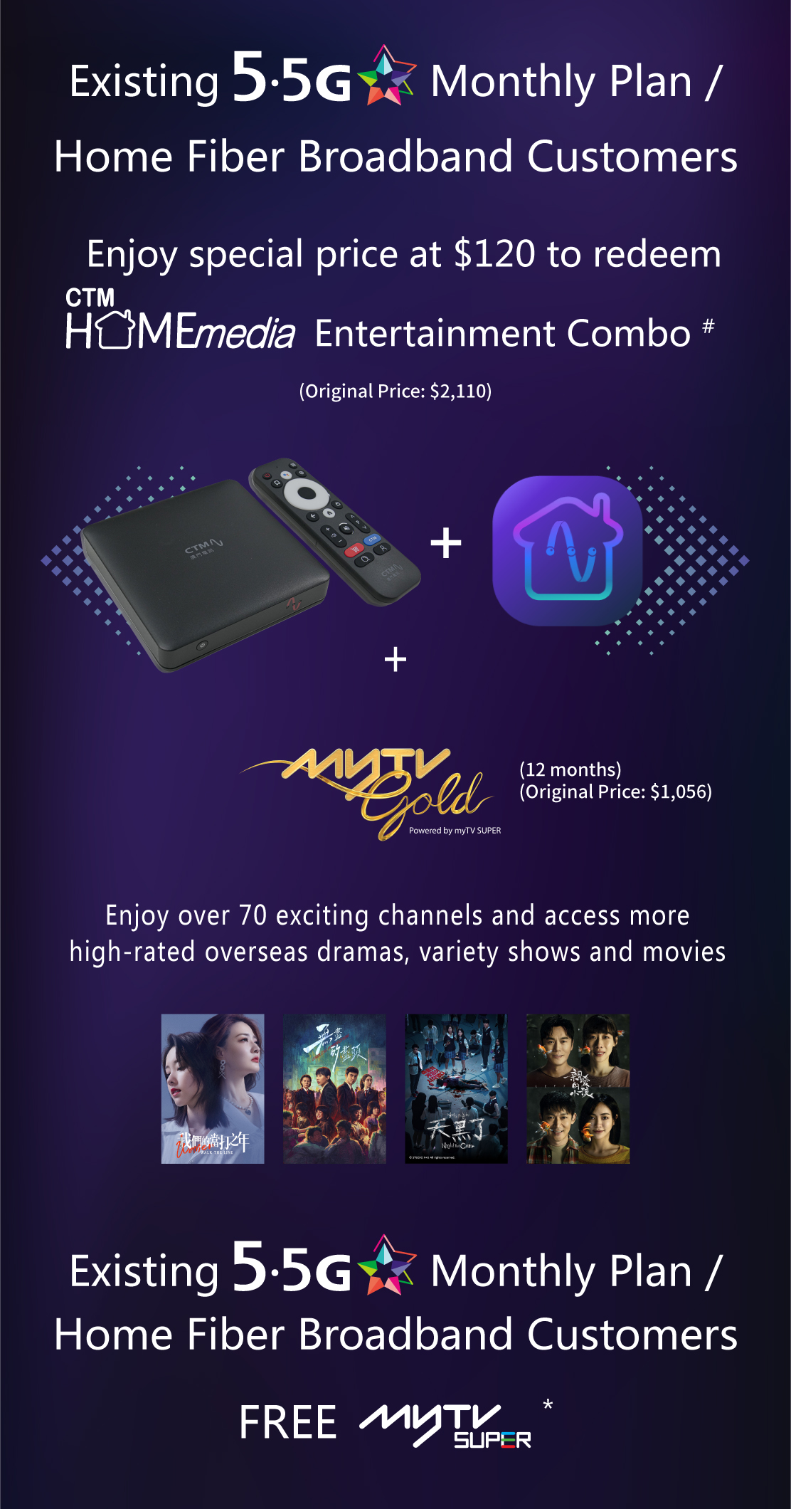 * This offer is only applicable to Mobile Plan Customers who subscribe 5.5G (5G-A) Monthly Plan and Home Media Entertainment Service - myTV SUPER Service (2 devices for App / Web) at the same time. The offer is valid until 31 / 12 / 2025, and the service will be automatically suspended after the promotion period. If customers want to continue using the service after the 12 months promotion period, customers can apply the service at a special price via CTM Buddy App (original price: $38 / month).