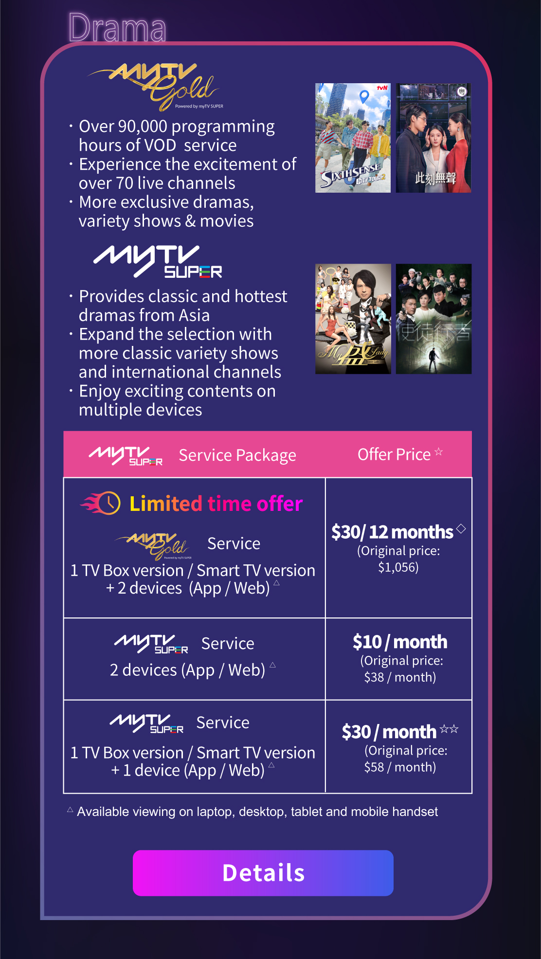 ◇ Customers can enjoy special price $30 / 12 month to upgrade to Home Media Content service – myTV Gold Service (1 TV Box version / Smart TV version + 2 devices for App / Web). After the 12 months promotion period, original offer price $58 will be charged if customers continue to use the service (original price: $88 / month).