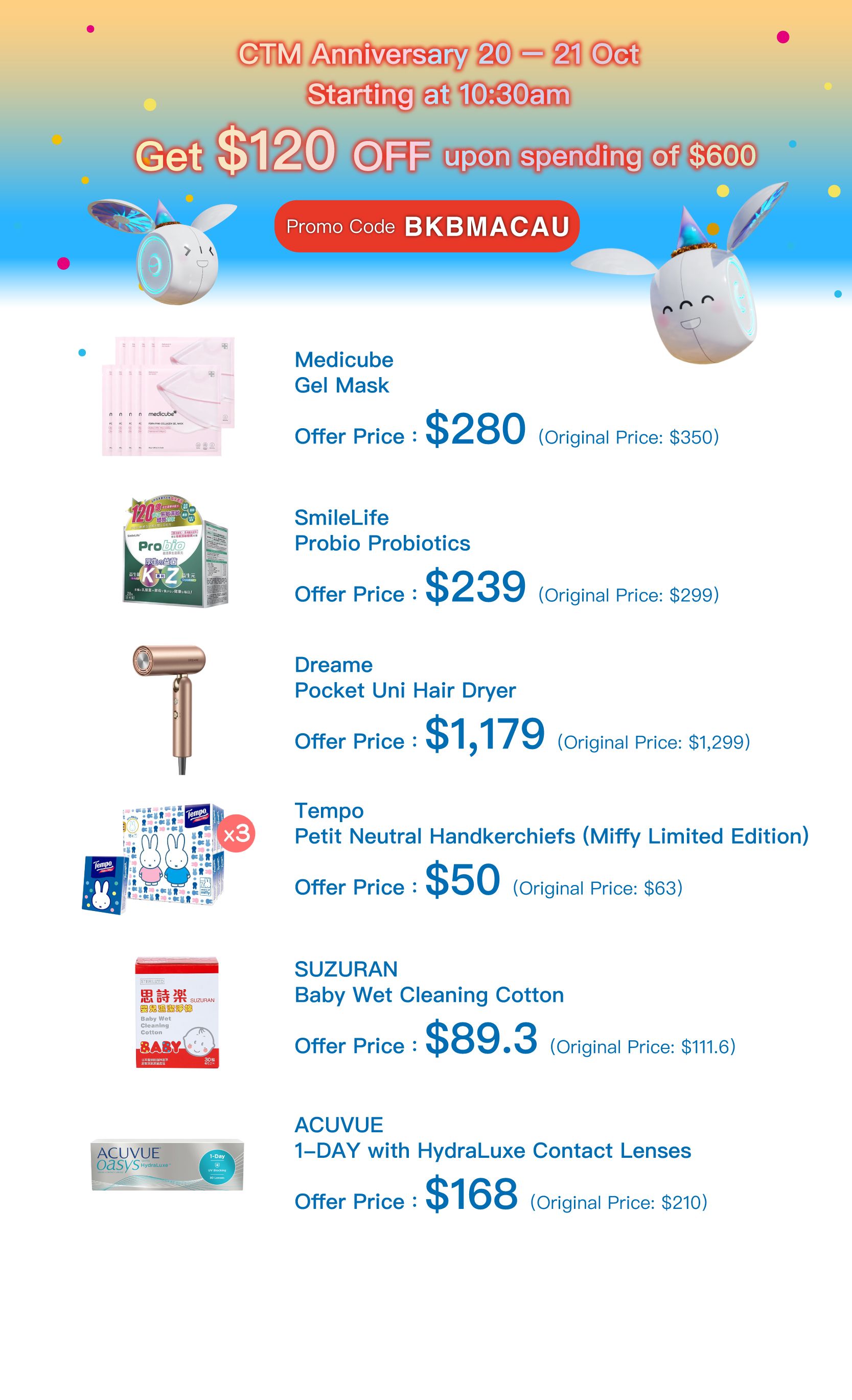 - The discount code is only applicable on 20 - 21 Oct at CTM x HKTVmall for online shopping, starting at 10:30am.