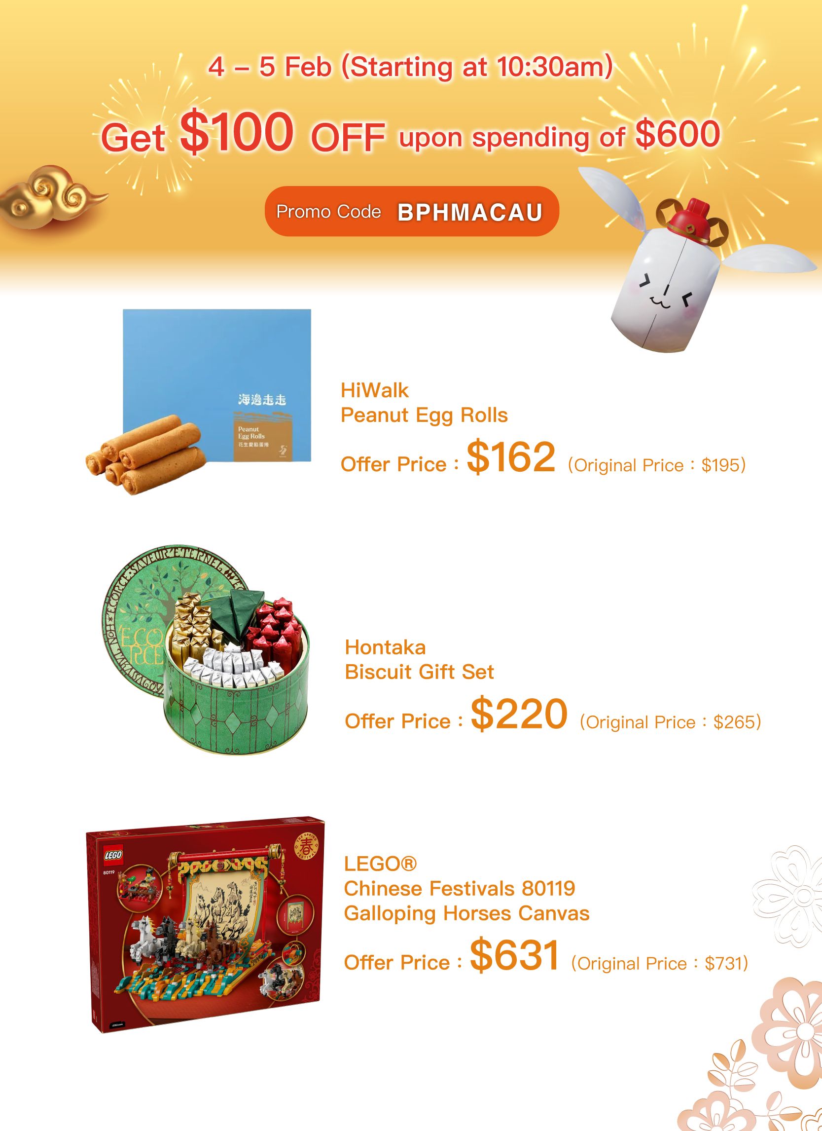 - When purchasing for a single order at $600, use the discount code [ BPHMACAU ] to enjoy $100 discount. Each account can only use the discount code for on specify date once.