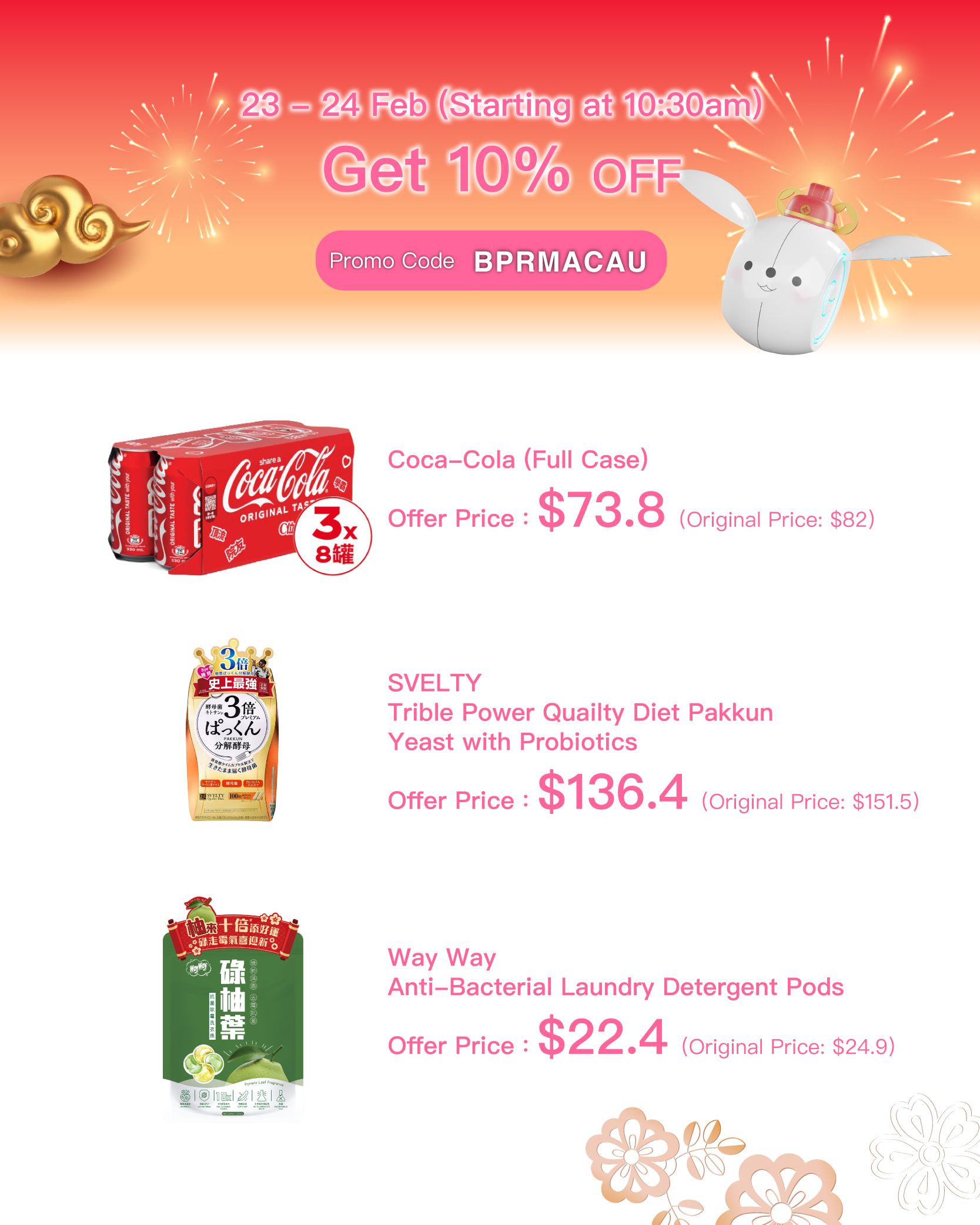 - When purchasing products for a single order, use the discount code [BPRMACAU] to enjoy 10% off discount, maximum discount $100 . Each account can only use the discount code at Jan once.