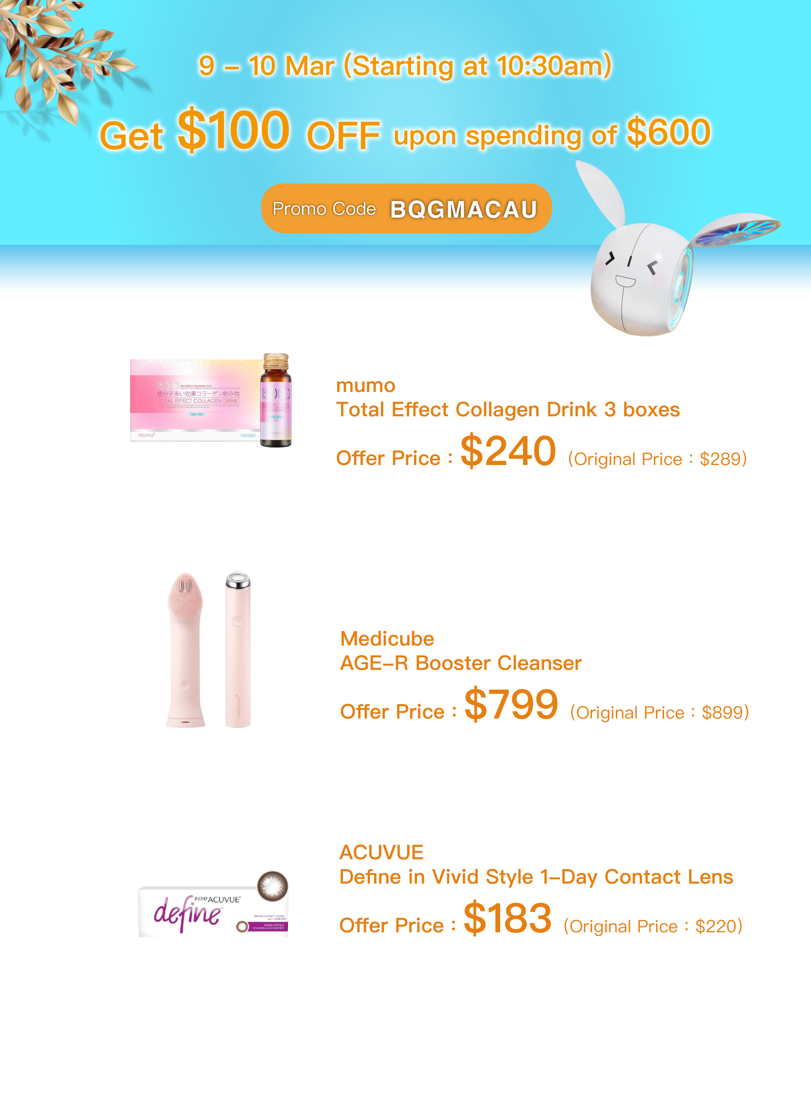 - When purchasing for a single order at $600, use the discount code [BQGMACAU] to enjoy $100 discount. Each account can only use the discount code for on specify date once.