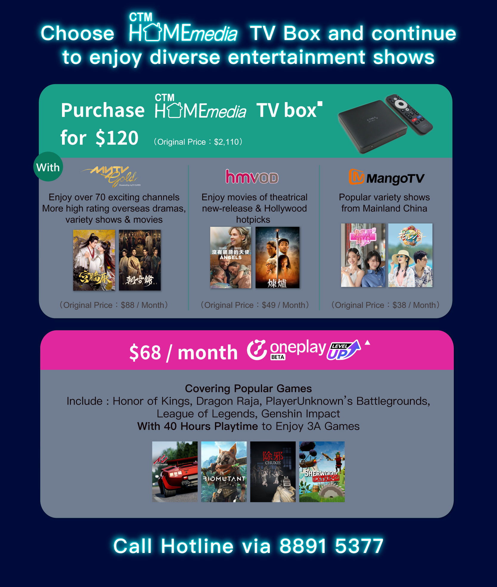 # If customers apply for 5Gbps or above plan and the installation address is designated Buildings before 17:00, the installation can be completed within 1 working day at the earliest. If the customer applies after 17:00, it will be regarded as an application for the next day and the express installation arrangement will be postponed. The specific express installation date will be determined based on the installation schedule. If it cannot be met, someone will contact the customer and provide the fastest installation date. ■ This offer is only applicable to customers who are newly subscribing to myTV Gold, hmvod, and Mango TV services. Existing "no.1 Club" members can enjoy an exclusive price of $120 for purchasing Home Media TV box with 12-month myTV Gold service (1 TV Box version / Smart TV version + Apps for 2 devices / web), 2-month of hmvod service (Original Price: $49 / month) and 2-month Mango TV service (Original Price: $38 / month). After the promotion period, if customers continue to use myTV Gold service, an offer price of $58 / month (Original Price: $88 / month) will be charged; if customers continue to use hmvod and Mango TV services, a combo price of $48 / month will be charged. Each mobile / Internet account can enjoy this offer once. ▴ OnePlay Cloud Gaming Service (Original Price: $80 / 30hours). To use the Cloud Gaming Service, customer must purchase the games from online game stores (Steam, Epic, Ubisoft, Blizzard, EA, Microsoft, and Fanatical) in advance. For the games available for Cloud Gaming Service, please refer to the game library in OnePlay Cloud Gaming Platform Service webpage (https://www.oneplay.in).