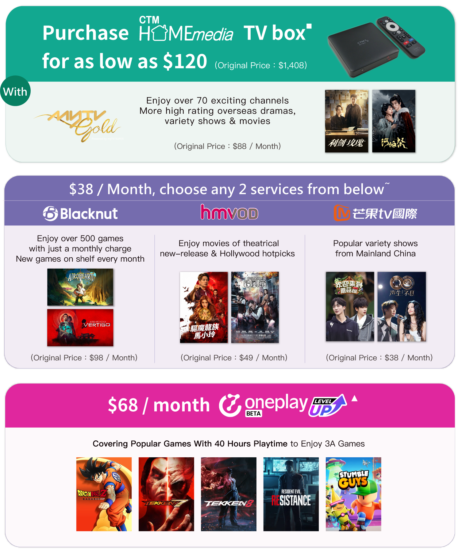 # If customers apply for 5Gbps or above plan and the installation address is designated Buildings before 17:00, the installation can be completed within 1 working day at the earliest. If the customer applies after 17:00, it will be regarded as an application for the next day and the express installation arrangement will be postponed. The specific express installation date will be determined based on the installation schedule. If it cannot be met, someone will contact the customer and provide the fastest installation date. ▪ This offer is only applicable to customers who newly subscribed Home Media Content service – myTV Gold service. Mobile Plan / Home Fiber Broadband customers can enjoy offer price $120 to purchase Home Media TV box with 6-month Home Media Content service – myTV Gold service (1 TV Box version / Smart TV version + Apps for 2 devices / web). After the promotional period, if customers continue to use the related service, an offer price of $58 / month (Original Price: $88 / month) will be charged to customer's bill account automatically. Each Mobile Plan / Home Fiber Broadband customer can enjoy this offer once. ~ Customers who newly subscribe / renew contract for Home Fiber Broadband / Mobile Plan can enjoy offer price $38 / month to purchase 2 Home Media Content services (Mango TV Deluxe Pack service / Blacknut Cloud Game service / hmvod service) before 31 / 3 / 2026. After the 3-month promotion period, if customers continue to use related service, a combo price of $48 / month will be charged to customer's bill account automatically. ▴ OnePlay Cloud Gaming Service (Original Price: $80 / 30hours). To use the Cloud Gaming Service, customer must purchase the games from online game stores (Steam, Epic, Ubisoft, Blizzard, EA, Microsoft, and Fanatical) in advance. For the games available for Cloud Gaming Service, please refer to the game library in OnePlay Cloud Gaming Platform Service webpage (https://www.oneplay.in).