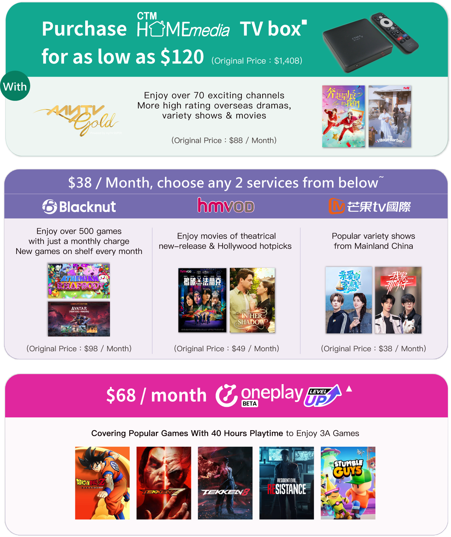 # If customers apply for 5Gbps or above plan and the installation address is designated Buildings before 17:00, the installation can be completed within 1 working day at the earliest. If the customer applies after 17:00, it will be regarded as an application for the next day and the express installation arrangement will be postponed. The specific express installation date will be determined based on the installation schedule. If it cannot be met, someone will contact the customer and provide the fastest installation date. ▪ This offer is only applicable to customers who newly subscribed Home Media Content service – myTV Gold service. Mobile Plan / Home Fiber Broadband customers can enjoy offer price $120 to purchase Home Media TV box with 6-month Home Media Content Service – myTV Gold service (1 TV Box version / Smart TV version + Apps for 2 devices / web) before 31 / 5 / 2026. After the promotional period, if customers continue to use the related service, an offer price of $58 / month (Original Price: $88 / month) will be charged to customer's bill account automatically. Each Mobile Plan / Home Fiber Broadband customer can enjoy this offer once. ~ Customers who newly subscribe / renew contract for Home Fiber Broadband / Mobile Plan can enjoy offer price $38 / month to purchase 2 Home Media Content services (Mango TV Deluxe Pack service / Blacknut Cloud Game service / hmvod service) before 30 / 4 / 2026. After the 3-month promotion period, if customers continue to use related service, a combo price of $48 / month will be charged to customer's bill account automatically. ▴ OnePlay Cloud Gaming Service (Original Price: $80 / 30hours). To use the Cloud Gaming Service, customer must purchase the games from online game stores (Steam, Epic, Ubisoft, Blizzard, EA, Microsoft, and Fanatical) in advance. For the games available for Cloud Gaming Service, please refer to the game library in OnePlay Cloud Gaming Platform Service webpage (https://www.oneplay.in).