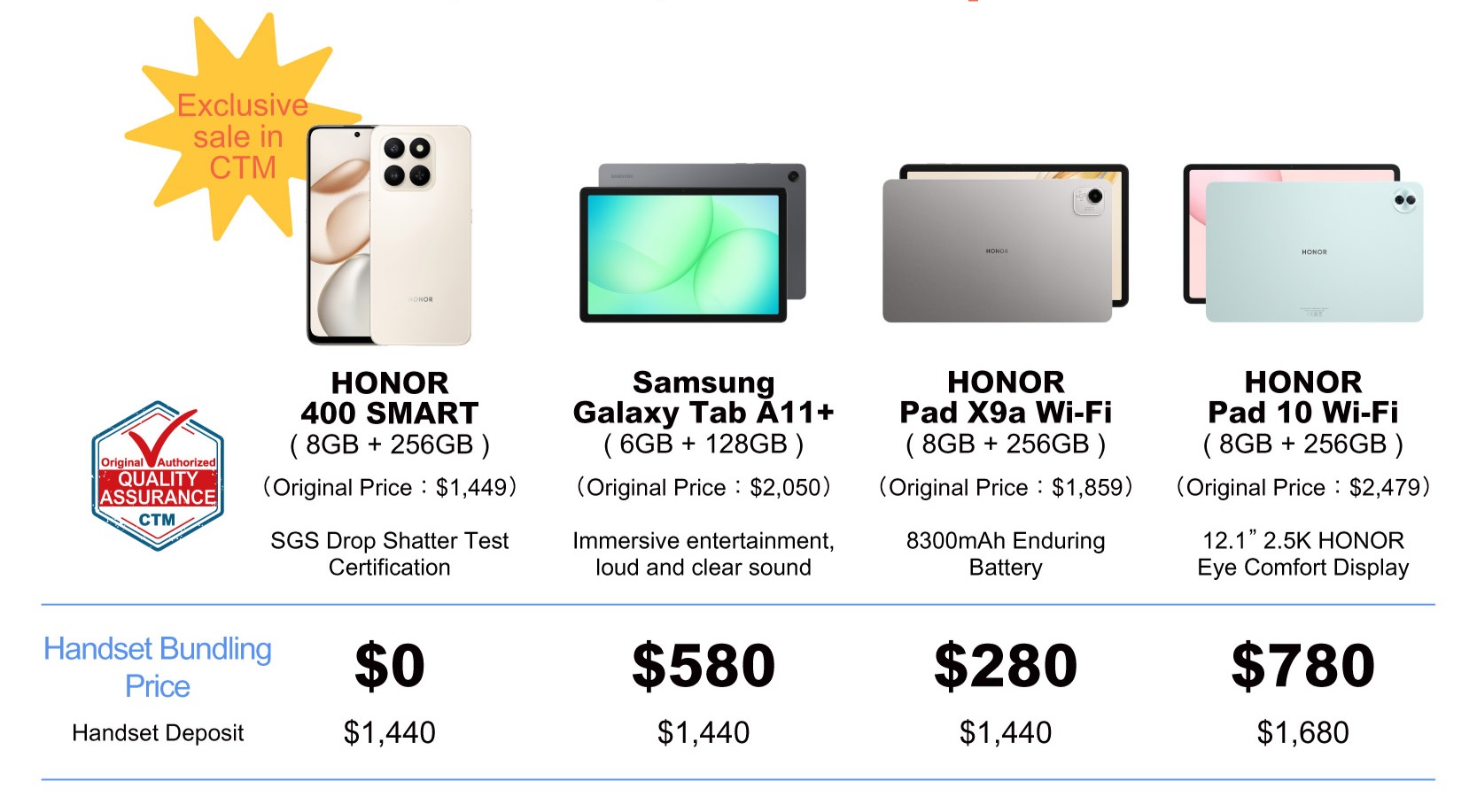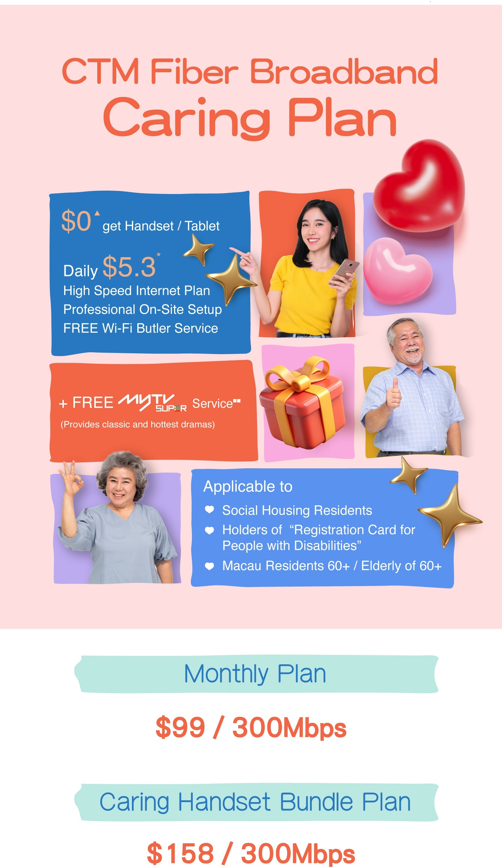 - The offer is valid until 31 / 12 / 2025. - This offer is only applicable to customers who applicant is required to be 60 years old or above / holders of “Registration Card for People with Disabilities”/ Social Housing Residents , customer needs to provide relevant proof when apply this offer / the installation address must be social housing when applying for this offer. Each customer can only use this offer once. - This offer price is subject to change without prior notice. All products and gifts are available while stock lasts. - All prices are in MOP. - The service is based on CTM Acceptable Use Policy "AUP". - Customers are bound by the respective service agreement. |