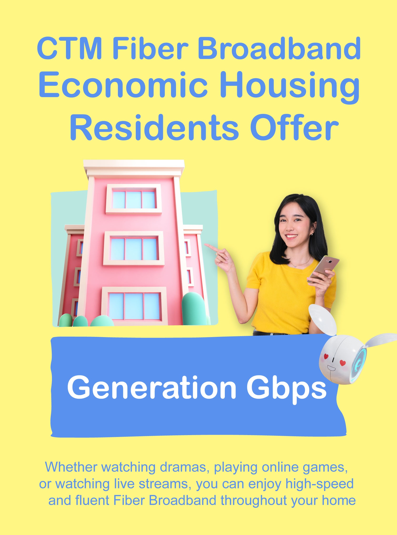 Notes: - This offer valid until 31 / 12 / 2025. - This offer is only applicable to newly subscribe / non-contract bound customers, customers are required to sign service contract with a 24-month. If a customer has a record of cancellation / downgrade of services within 2 months prior to the application date and reapplies for internet service, they will not be eligible for this promotion. Apply for Fiber 360° Service which includes 1 Fiber Broadband Modem and 2 Fiber Broadband Routers. Customer can apply for additional Wi-Fi Router based on environment or usage requirements, each extra Wi-Fi Router offered an offer price of $10 / month (Original Price: $15 / month). - This offer is only applicable to economic housing residents and the installation address must be economic housing when applying for this offer. Each customer can only use this offer once. - This offer price is subject to change without prior notice. - All products and gifts are available while stock lasts. - All prices are in MOP. - The service is based on CTM Acceptable Use Policy "AUP". Customers are bound by the respective service agreement.