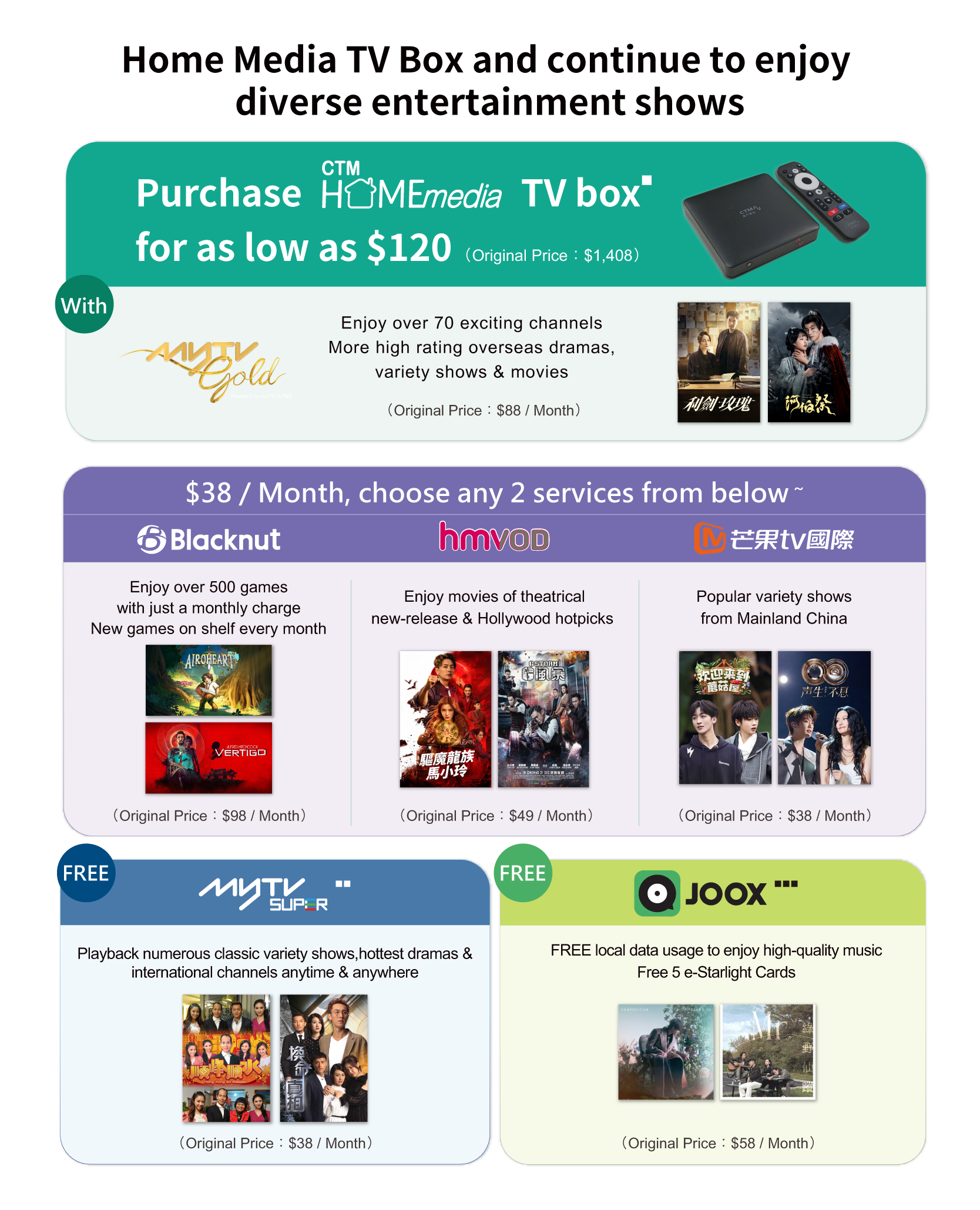 ▪ This offer is only applicable to customers who newly subscribed Home Media Content service – myTV Gold service. Mobile Plan / Home Fiber Broadband customers can enjoy offer price $120 to purchase Home Media TV box with 6-month Home Media Content service – myTV Gold service (1 TV Box version / Smart TV version + Apps for 2 devices / web). After the promotional period, if customers continue to use the related service, an offer price of $58 / month (Original Price: $88 / month) will be charged to customer's bill account automatically. Each Mobile Plan / Home Fiber Broadband customer can enjoy this offer once.