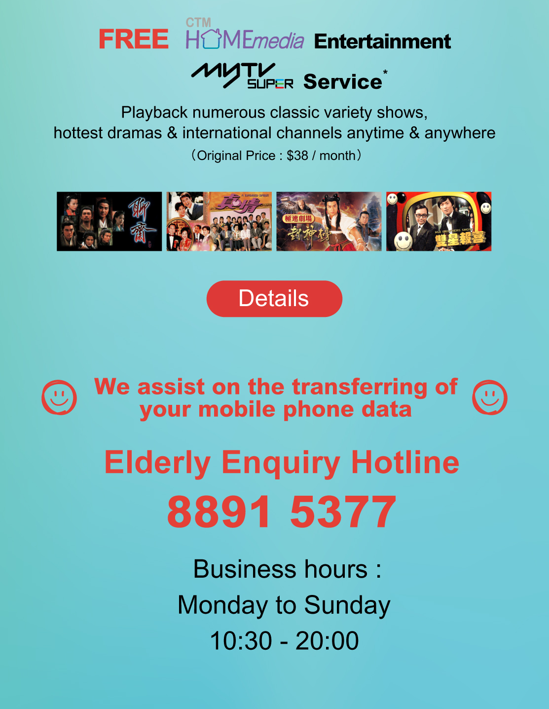 * Subscribe 5.5G (5G-A) Mobile Plan, enjoy FREE myTV SUPER service (Apps / Web for 2 devices)(Original Price: $38 / month) until 31 / 12 / 2025, and the service will be automatically terminated after the promotion period. If customers want to continue using the service, customers can apply via CTM Buddy App.