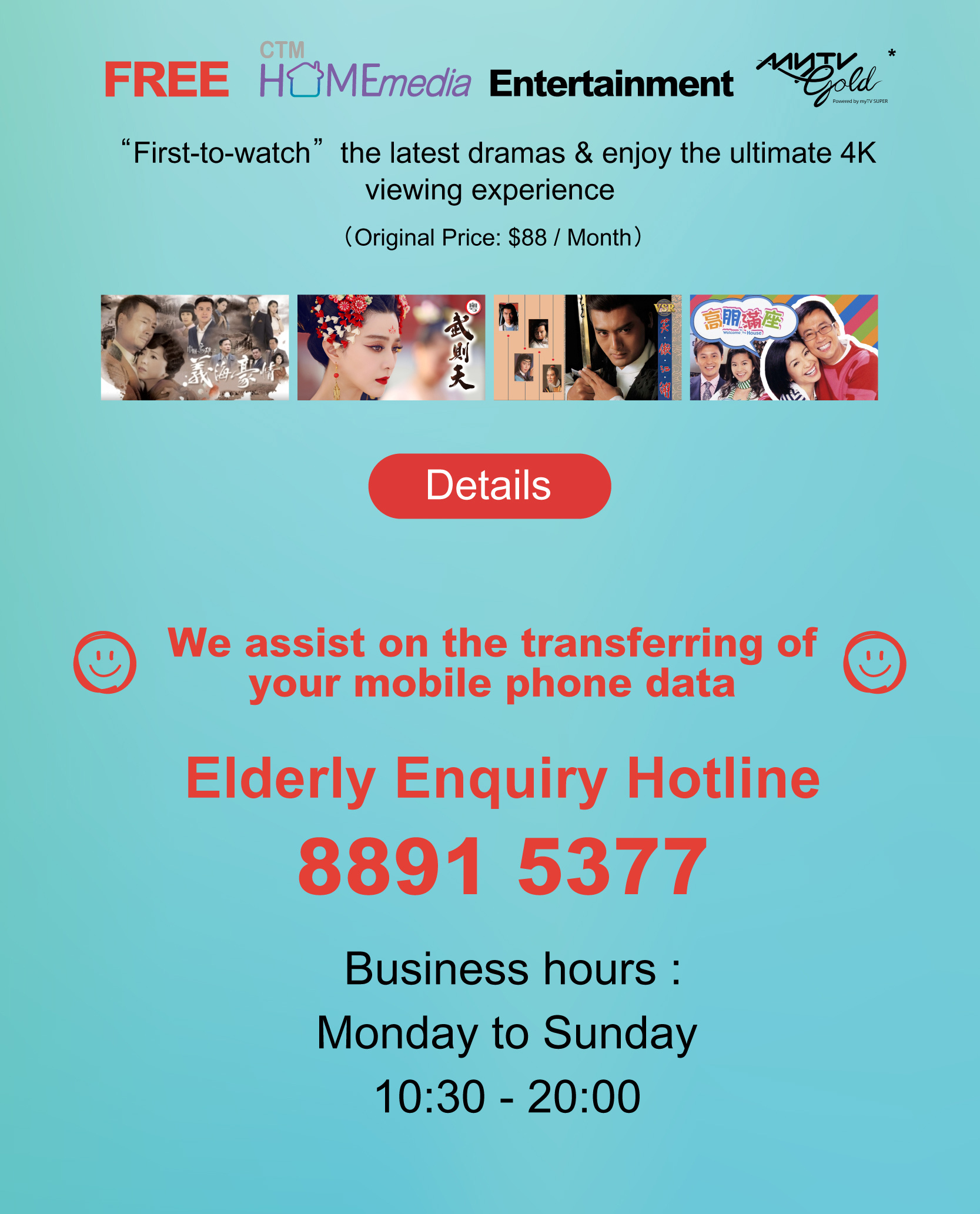 * Subscribe 5.5G (5G-A) Mobile Plan, enjoy FREE 1 month Home Media Content service – myTV Gold service (1 TV Box version / Smart TV version + Apps for 2 devices / web) (Original Price: $88 / month), and the service will be automatically terminated after the promotion period.