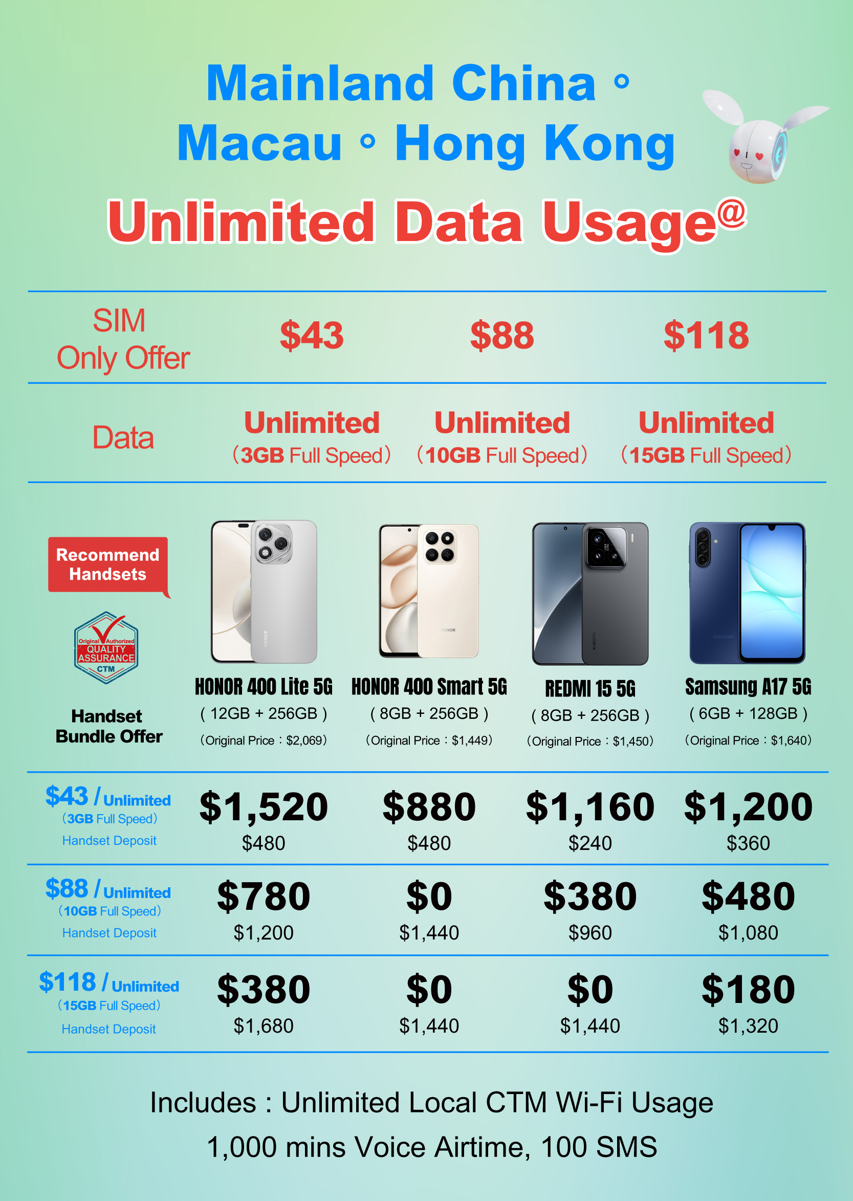 - Eligible Macau Citizen who subscribes the Elderly Handset Bundle Plan can waive handset deposit and each customer is entitled to join this offer ONCE.