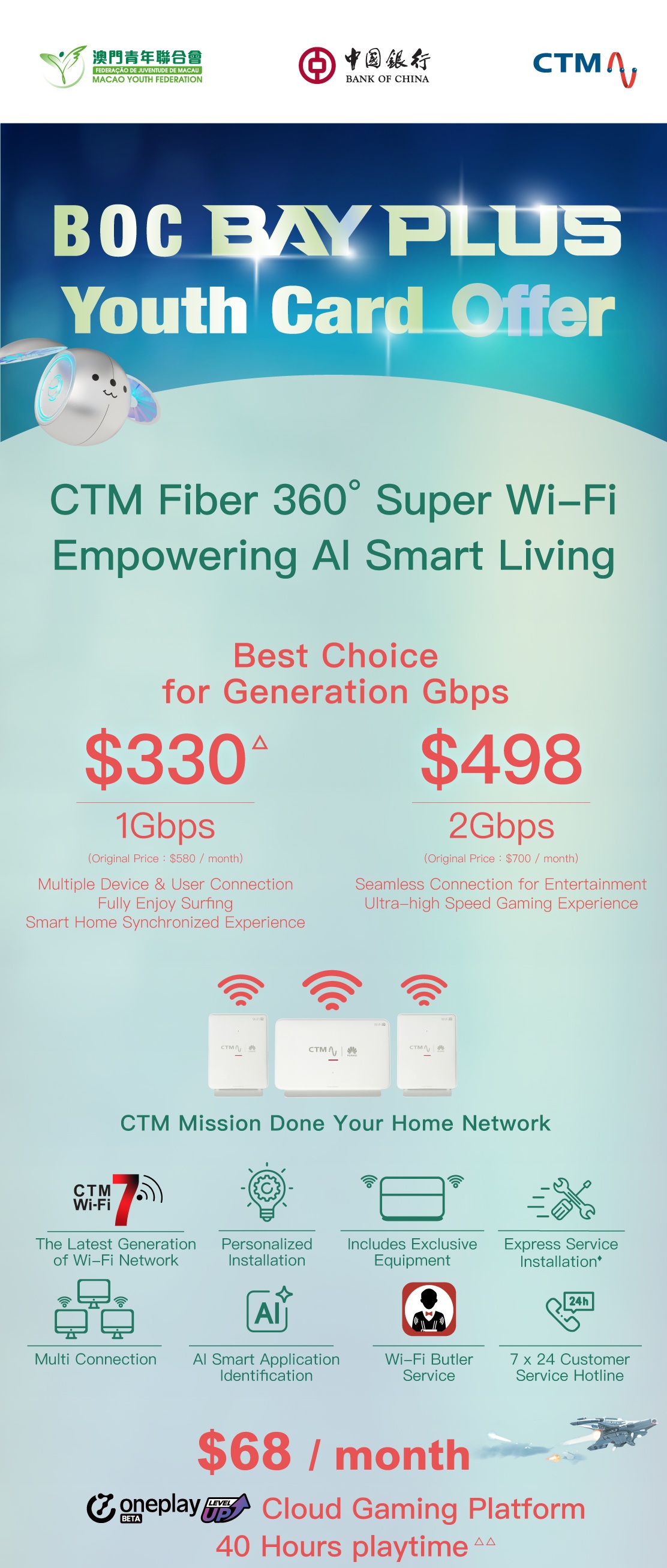 Note:This offer valid until 31 / 10 / 2025. This offer is applicable for Internet customers only. The offer is bound by the related terms and conditions. This offer price is subject to change without prior notice. All prices are in MOP.