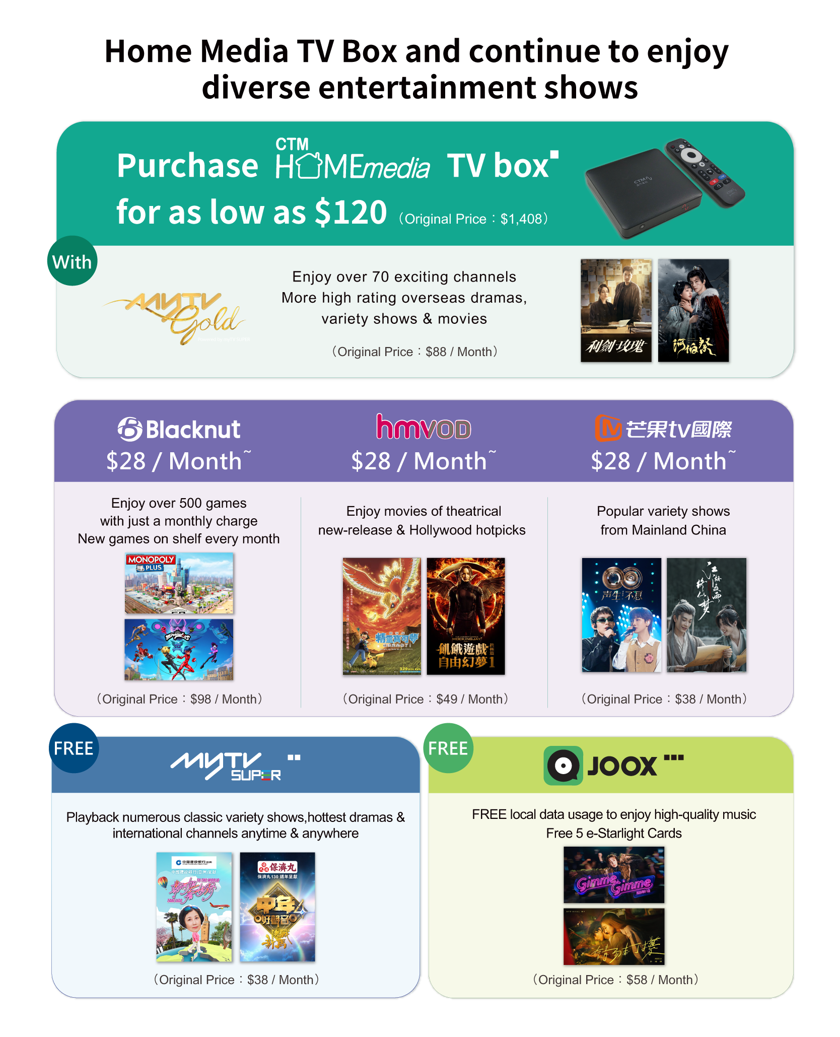 ▪ This offer is only applicable to customers who newly subscribed Home Media Content service – myTV Gold service. Mobile Plan / Home Fiber Broadband customers can enjoy offer price $120 to purchase Home Media TV box with 6-month Home Media Content service – myTV Gold service (1 TV Box version / Smart TV version + Apps for 2 devices / web). After the promotional period, if customers continue to use the related service, an offer price of $58 / month (Original Price: $88 / month) will be charged to customer's bill account automatically. Each Mobile Plan / Home Fiber Broadband customer can enjoy this offer once.