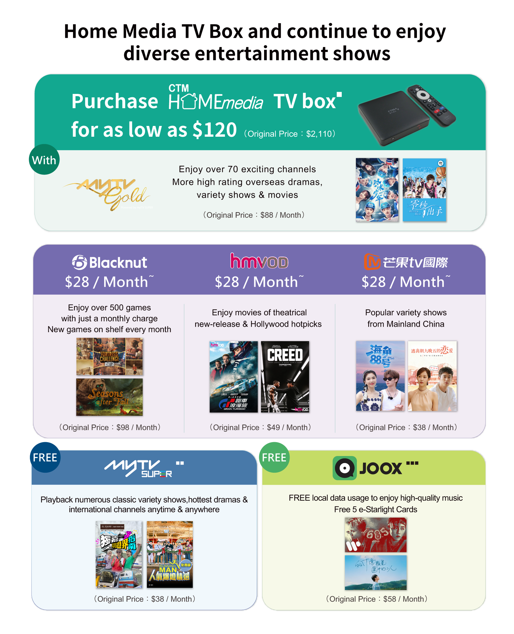 ▪ This offer is only applicable to customers who newly subscribed myTV Gold service. Mobile Plan / Home Fiber Broadband customers can enjoy offer price $120 to purchase Home Media TV box with 12-month myTV Gold service (1 TV Box version / Smart TV version + Apps for 2 devices / web). After the promotional period, if customers continue to use myTV Gold service, an offer price of $58 / month (Original Price: $88 / month) will be charged. Each Mobile Plan / Home Fiber Broadband customer can enjoy this offer once.