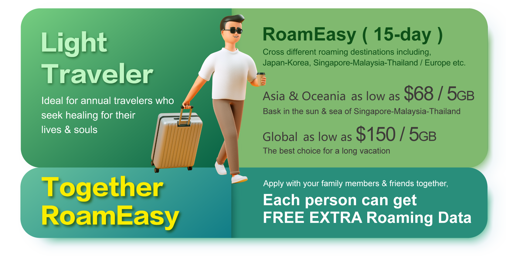 ^ This offer is only applicable to CTM Postpaid Customers. You are required to enter all the Mobile No. of related friends (maximum 4 users including the applicant) upon application. Those relevant nos. will be applying to the same RoamEasy (15-Day) service type with the same effective date. The service charge will be debit as a one-time payment to the applicant's account. Upon successful application, all customers' roaming data will be activated on the same selected effective date; and for any cancellation during the service effective period, all related customers’ roaming data will be terminated at the same time.
