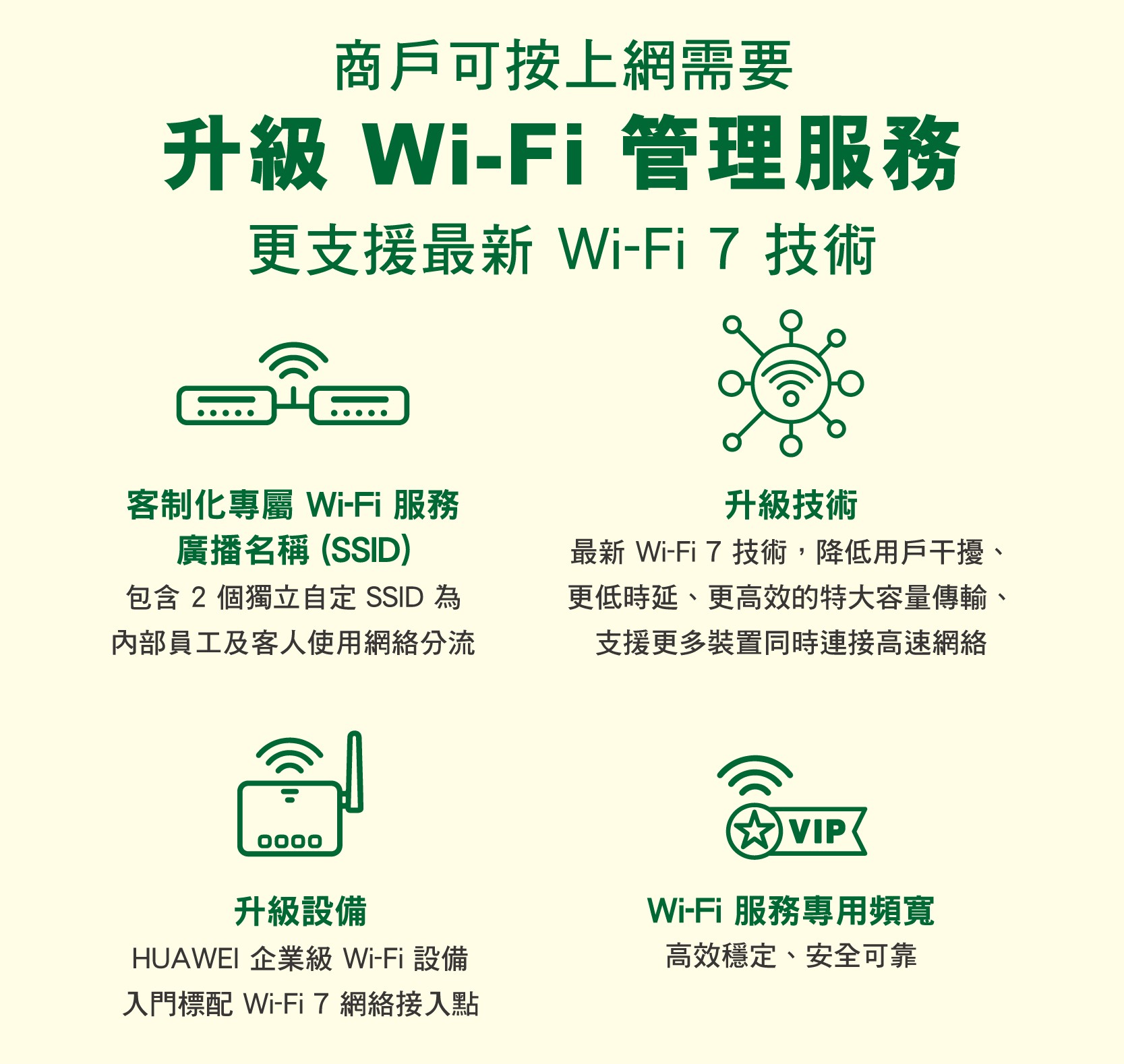 - CTM 商業 Wi-Fi 服務最高支援 Wi-Fi 7 三頻設備,標準配置為 Wi-Fi 7 雙頻設備。如有更高需求,歡迎與客戶服務經理聯絡更多資訊及報價。