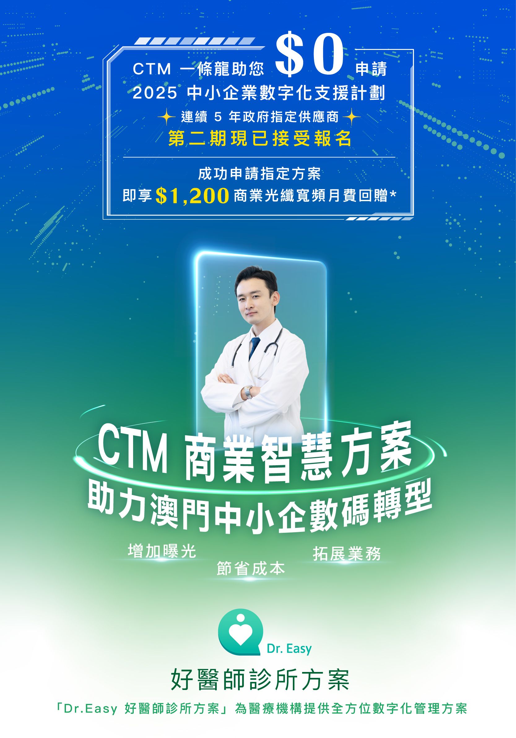 * 只適用於申請「2025 中小企業數字化支援計劃」並獲中簽的商業光纖寬頻客戶,並需選擇以下方案:好醫師 (Dr. Easy) / e掌櫃 (ePOS) / 商業通訊及移動辦公 (Macau vWork)。於服務合約正式生效後,客戶可享有其名下商業光纖寬頻服務之月費回贈,$1,200 月費回贈將於合約期內平均分 12 個月派發,即每月 $100 月費回贈。如合約期內提前終止 / 暫停相關商業光纖寬頻服務,客戶於服務期間所享有之服務月費回贈亦將終止。
