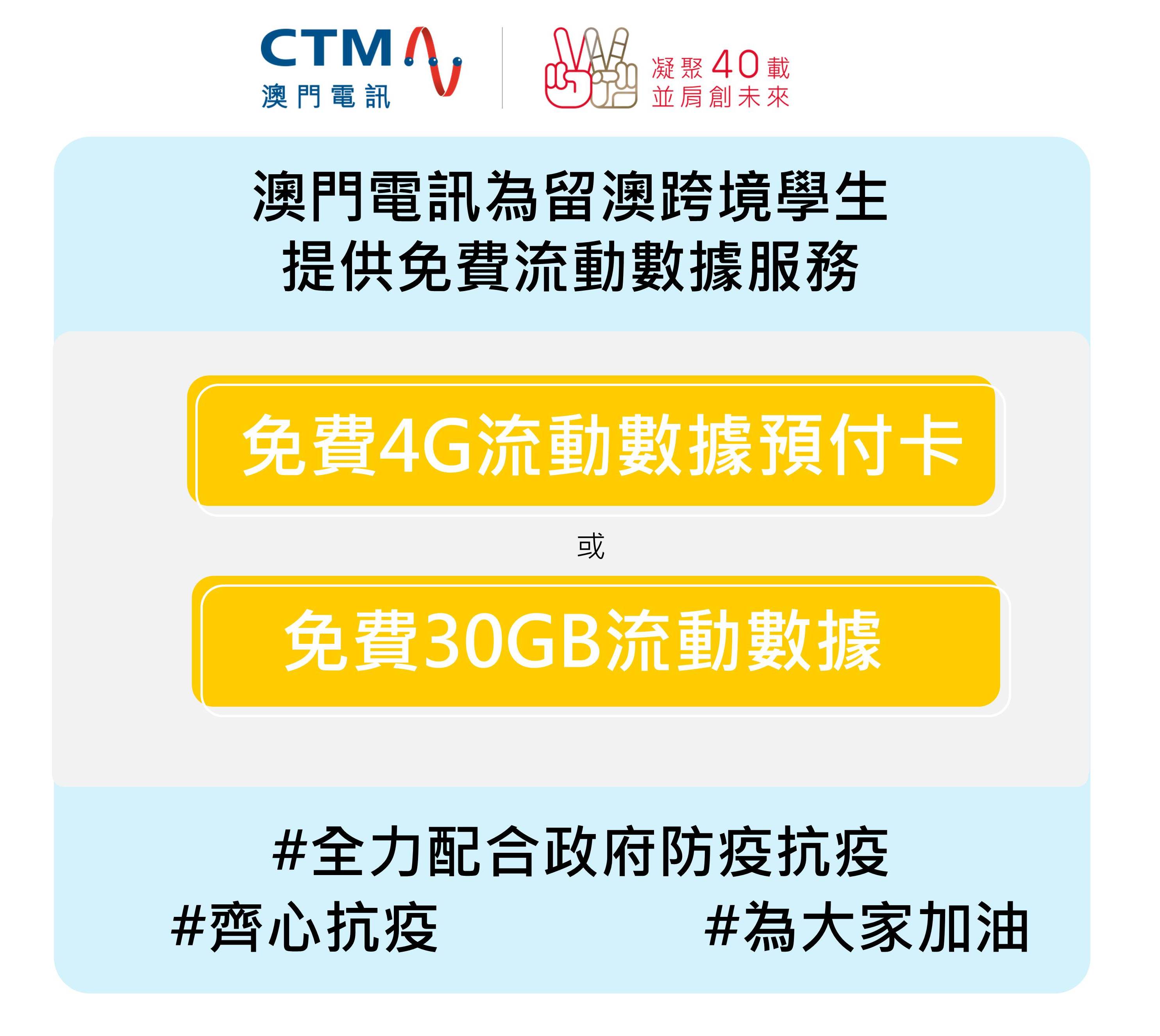 為支援因通關措施更動而暫時留澳的跨境學生的通訊需要,澳門電訊主動聯絡教育及青年發展局(教青局),向教青局安排入住各住宿地點的跨境學生,提供免費的4G流動數據預付卡、或30GB流動數據服務,讓學生能夠在留澳期間能夠繼續與親人保持聯繫及關注最新疫情發展。