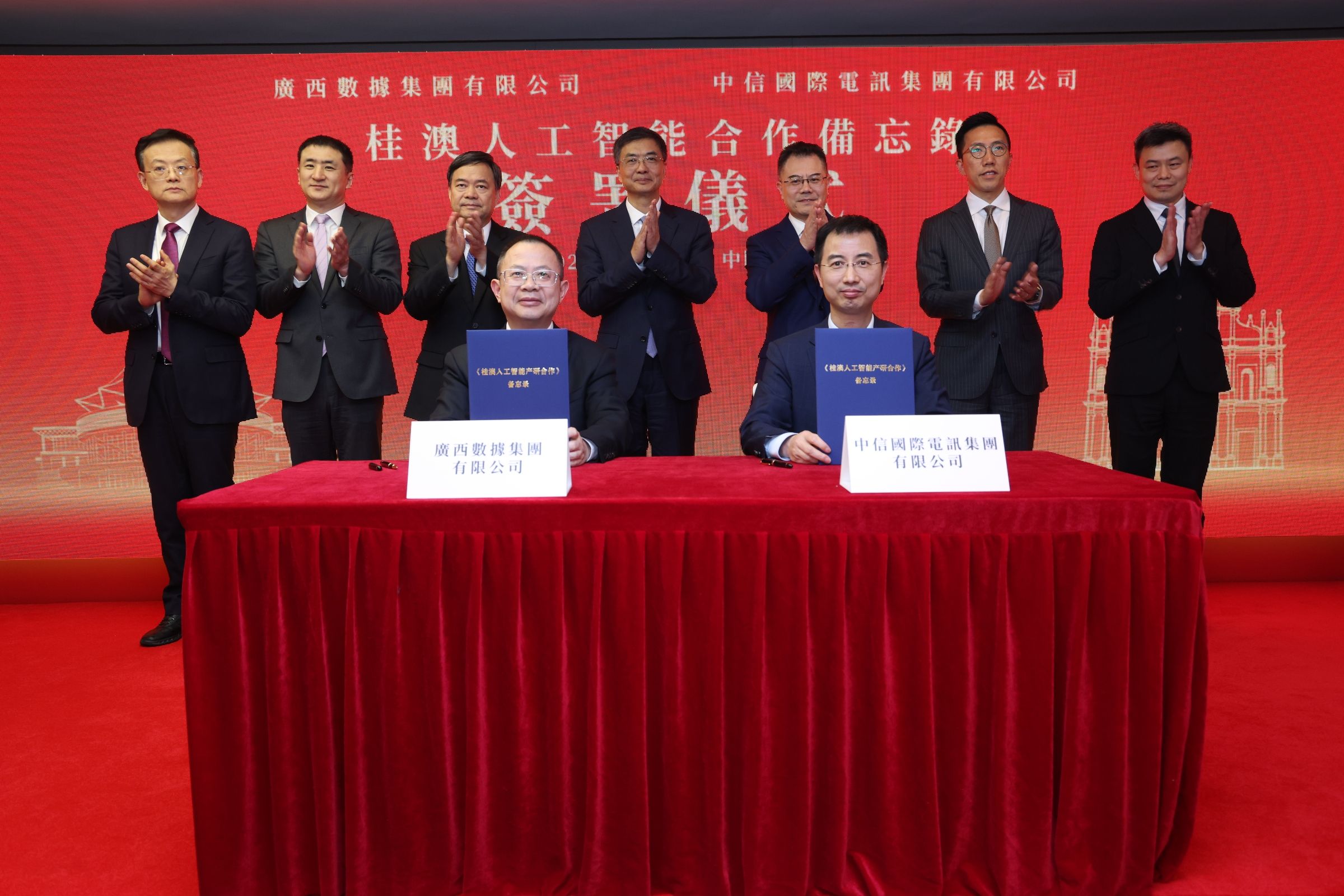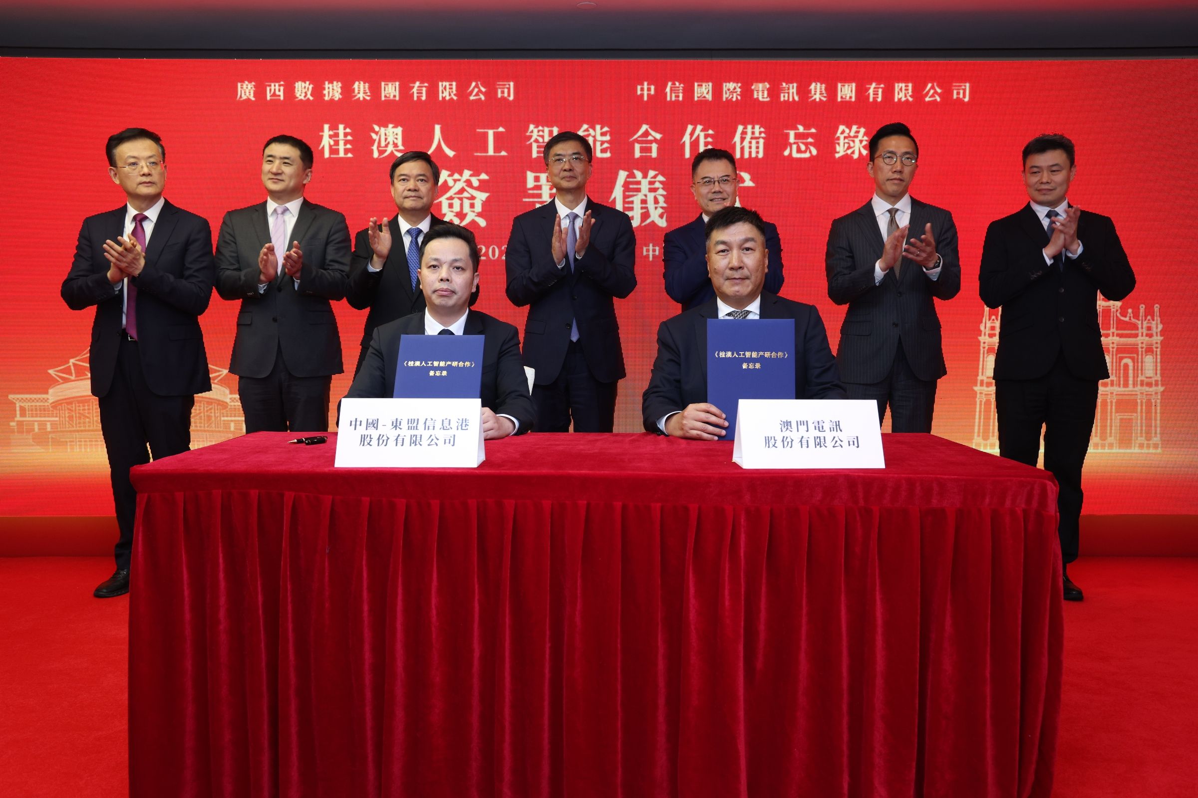 廣西壯族自治區黨委書記陳剛率團訪問澳門,訪問團包括自治區政協副主席、自治區黨委秘書長周異決,自治區人民政府副秘書長、自治區大數據發展局局長趙志剛,自治區港澳事務辦公室主任魏然,自治區發展和改革委員會主任白松濤,自治區商務廳黨組書記、自治區產業園區改革發展辦公室主任鄒展業等一行,與澳門政策研究和區域發展局局長張作文、澳門經濟及科技發展局局長邱潤華、澳門郵電局副局長劉蘭華、中信集團副總經理王國權、中信國際電訊集團主席羅西成、行政總裁吳軍、澳門電訊行政總裁潘福禧等進行「桂澳人工智能合作」座談會,就桂澳在人工智能及算力營運合作、跨境數據合規及流動保障等多項重要議題展開深入交流。