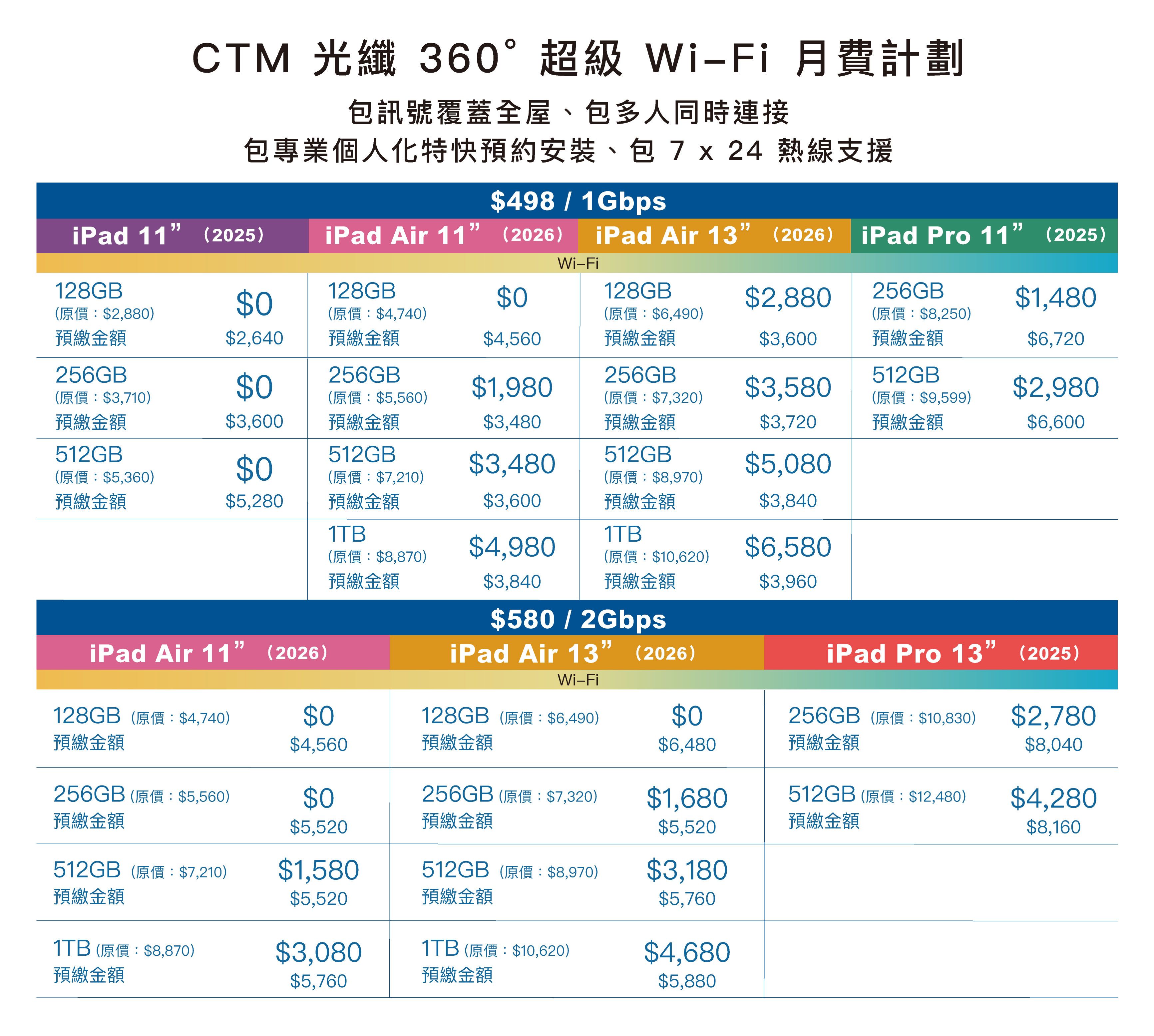 註: - 優惠期至 2026 年 3 月 31 日。 - 此優惠只適用於新申請 / 現有無產品合約束縛之客戶。 優惠只適用於互聯網月費客戶。 - 客戶須簽署 24 個月合約。 若客戶於合約期內終止其互聯網服務、轉低收費類別,有關之按金將在客戶之互聯網帳戶內自動收取,而有關之優惠將被終止。 - 以上優惠受相關之服務條款所約束。優惠不可與其他優惠同時使用。 以上優惠及最新價格如有更改,恕不另行通知。 所有價格以澳門幣計算。