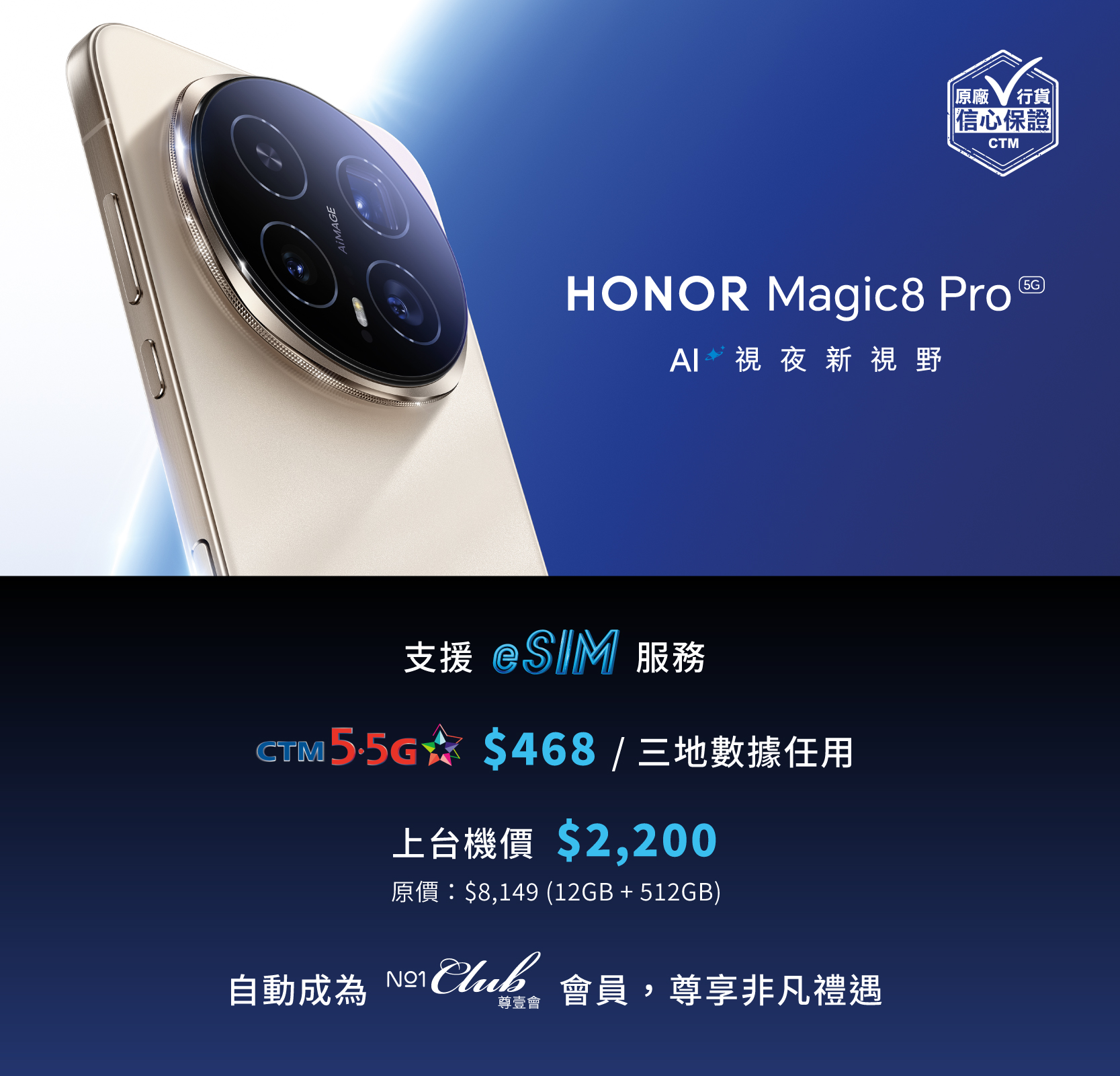 HONOR Magic8 Pro 5.5G 16GB + 1TB (原價:$9,599) | $3,700 | $2,700 | $0 | $0 | $0 |