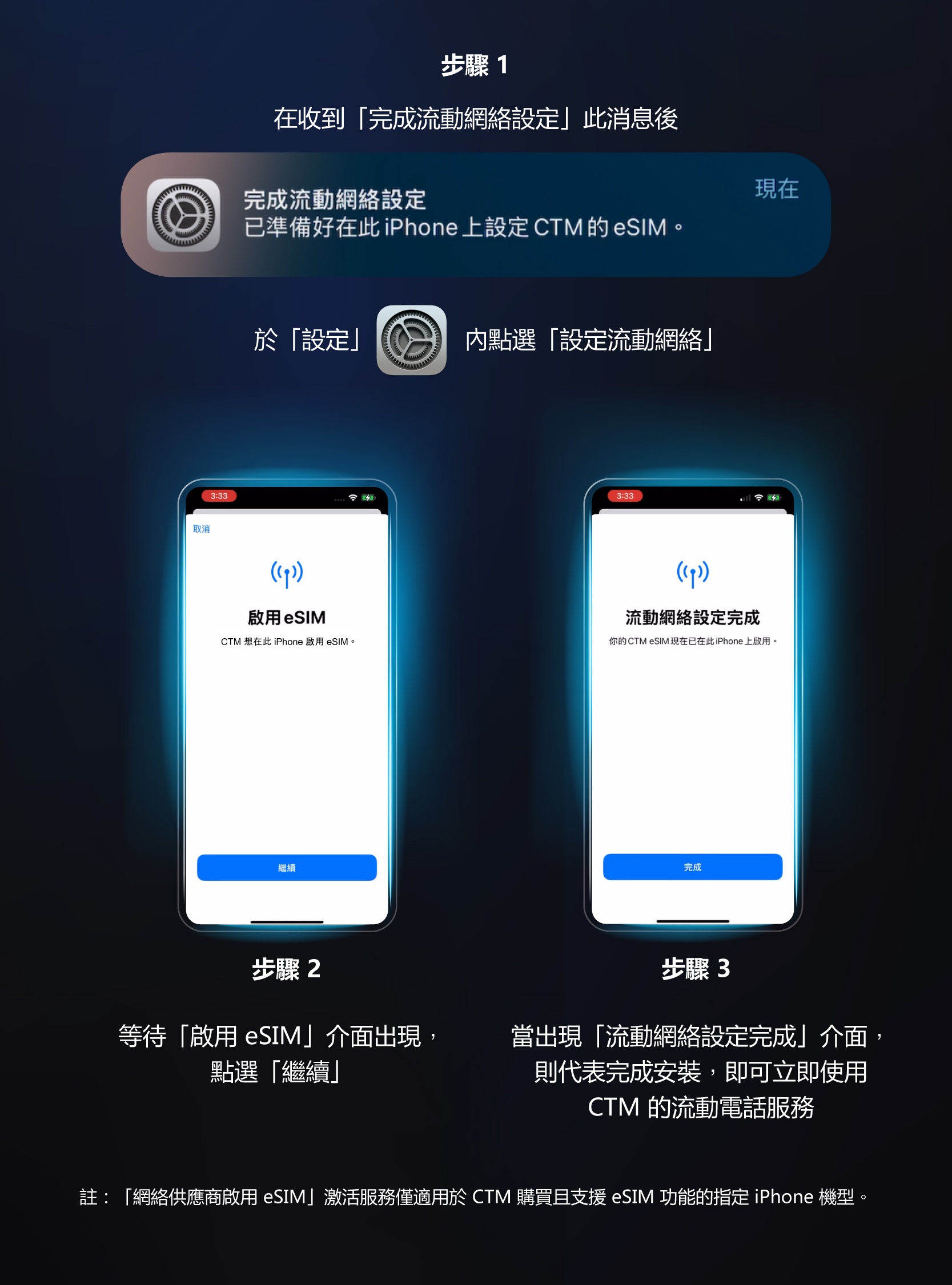 於您的設備安裝 CTM eSIM - iOS 用戶使用「網絡供應商啟用 eSIM」激活