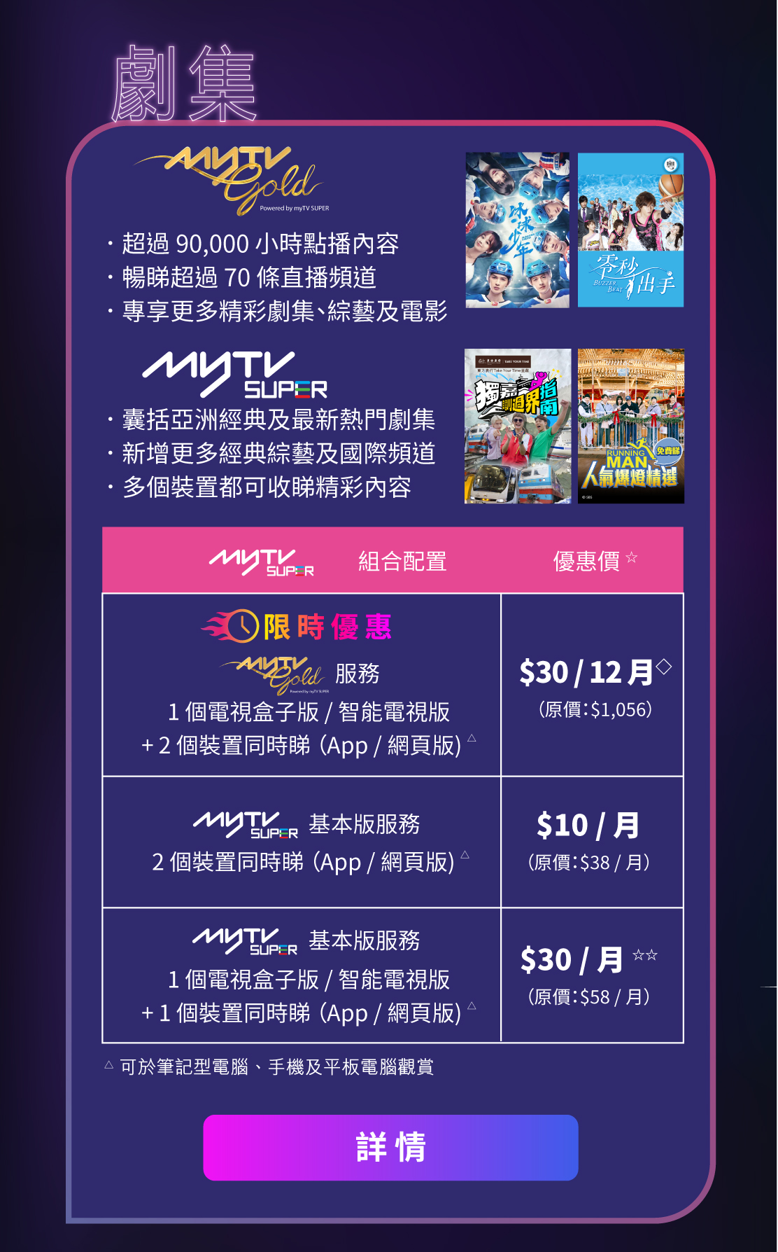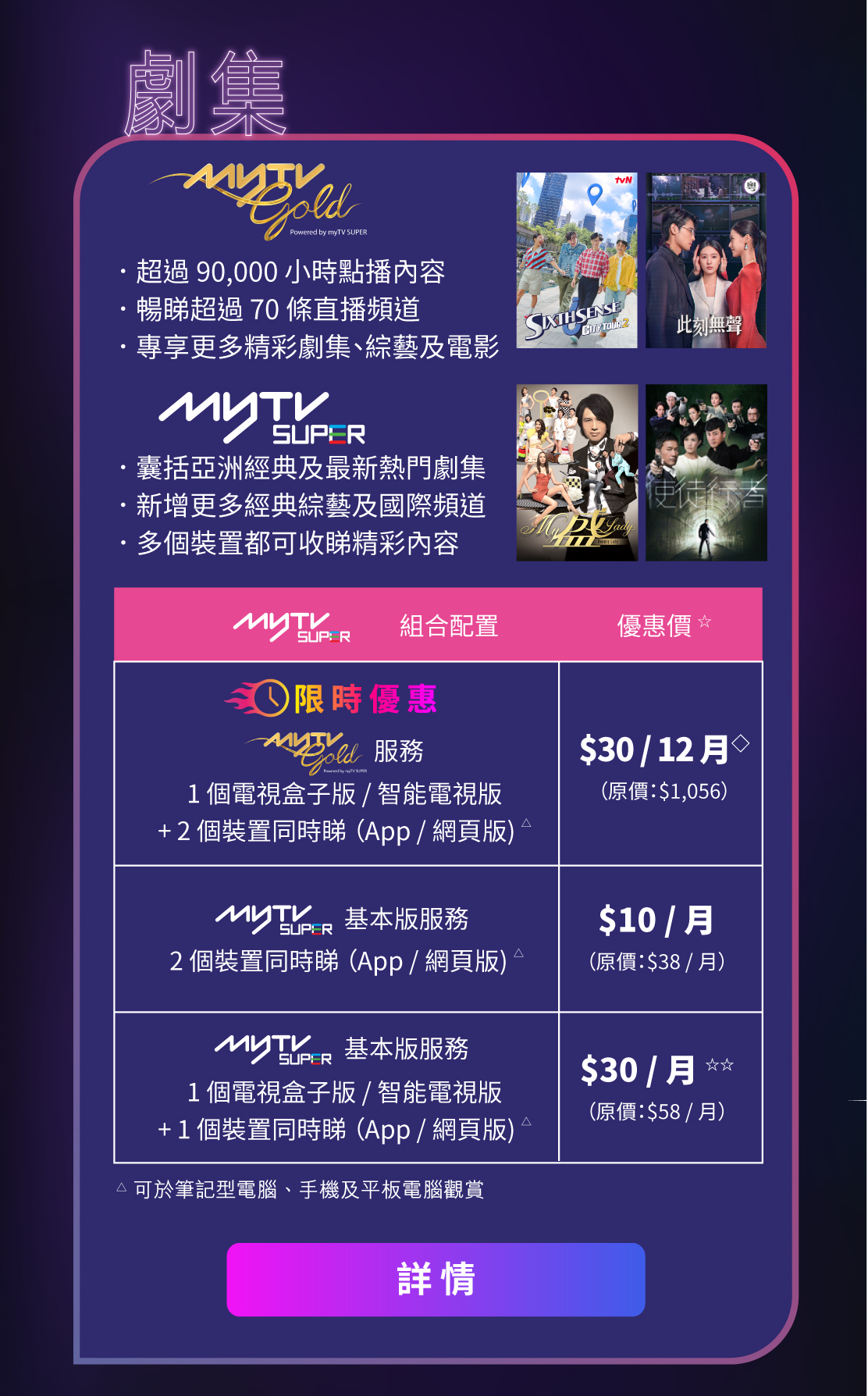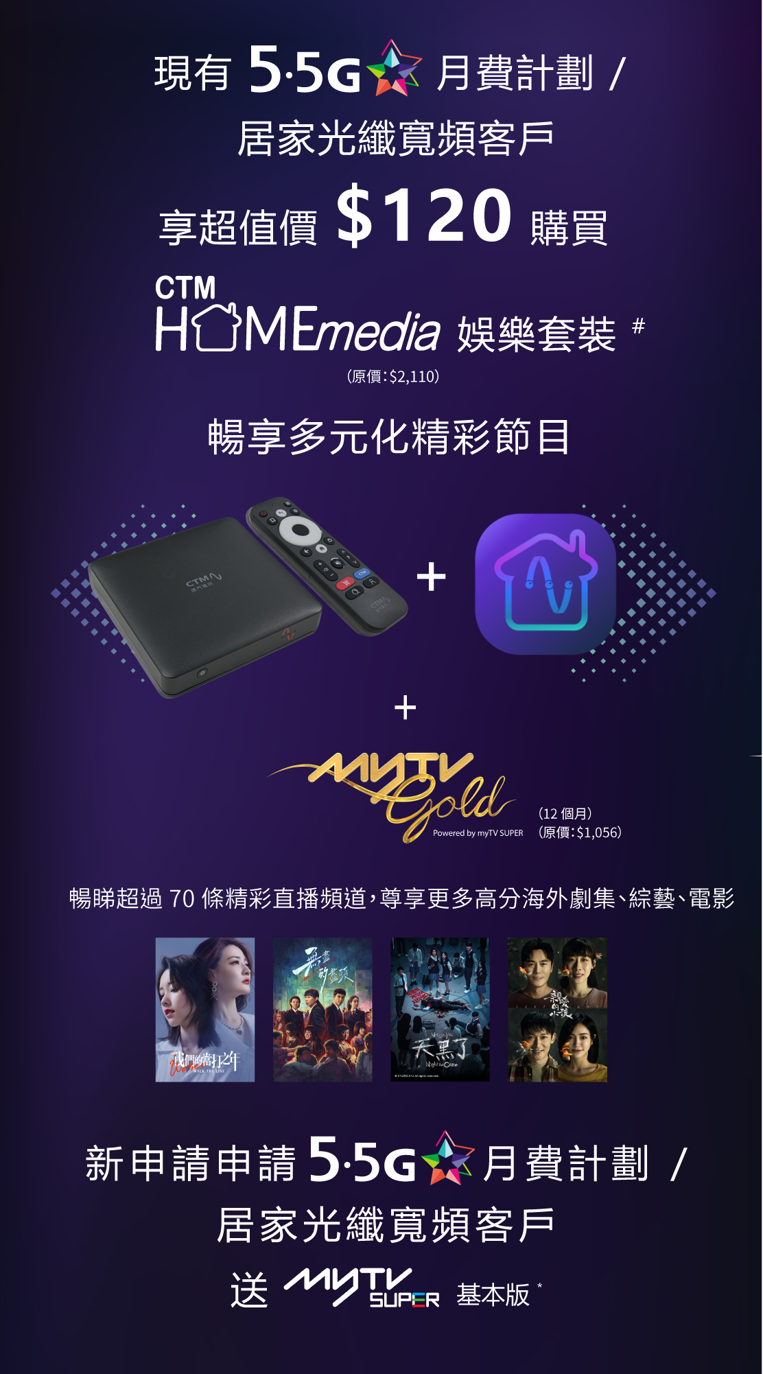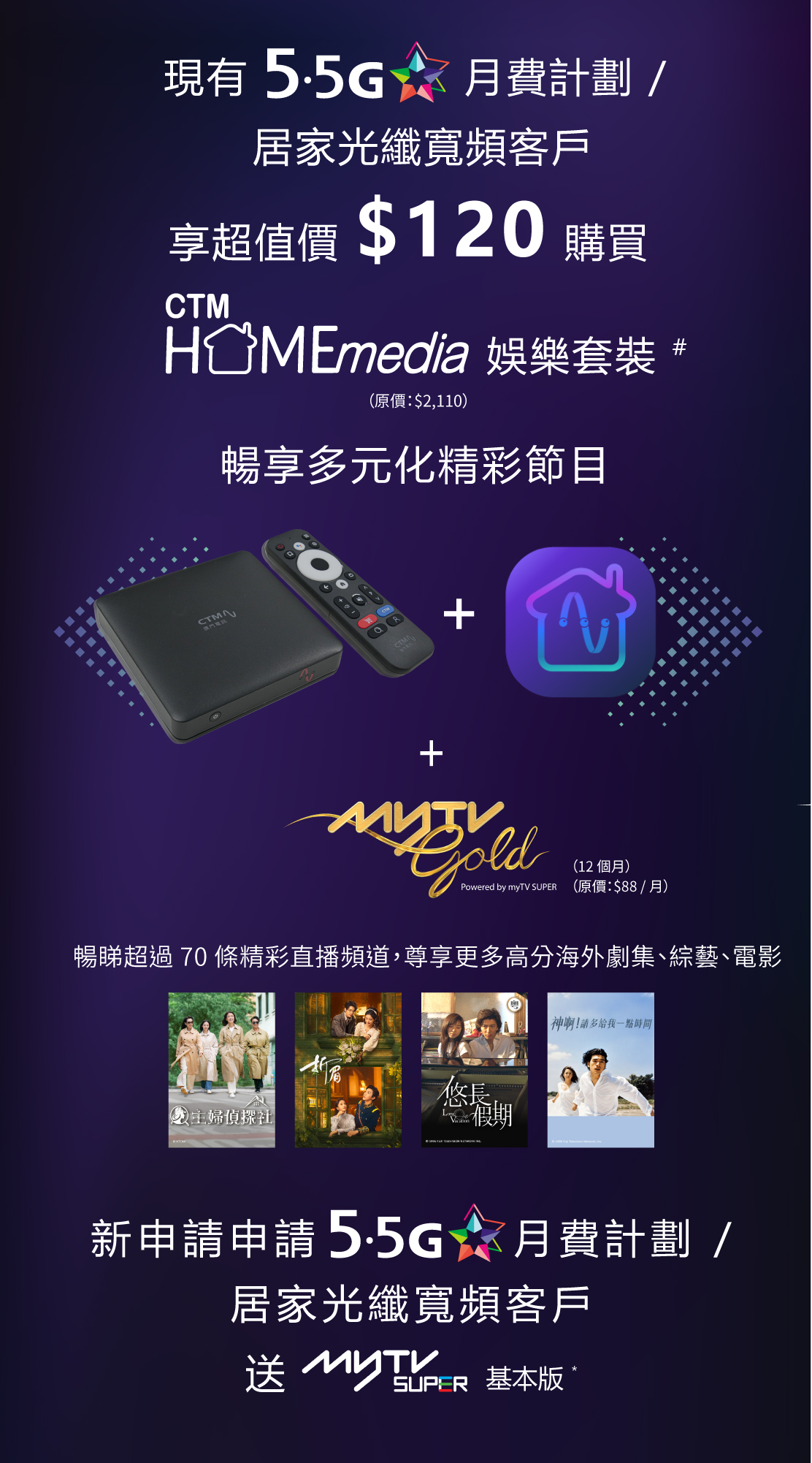 * 申請 5.5G (5G-A) 月費計劃,即送 Home Media 娛樂服務 – myTV SUPER 服務 (2 個裝置 App / 網頁版)(原價:$38 / 月) 至 2025 年 12 月 31 日,期後服務會自動停止。申請光纖寬頻客戶,即送 Home Media 娛樂服務 – myTV SUPER 服務 ( 1個裝置 電視盒子版 / 智能電視版 + 1 個裝置 App / 網頁版 ) (原價: $58 / 月) 至 2025 年 12 月 31 日,期後服務會自動停止。