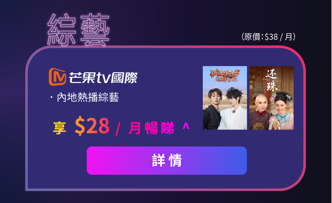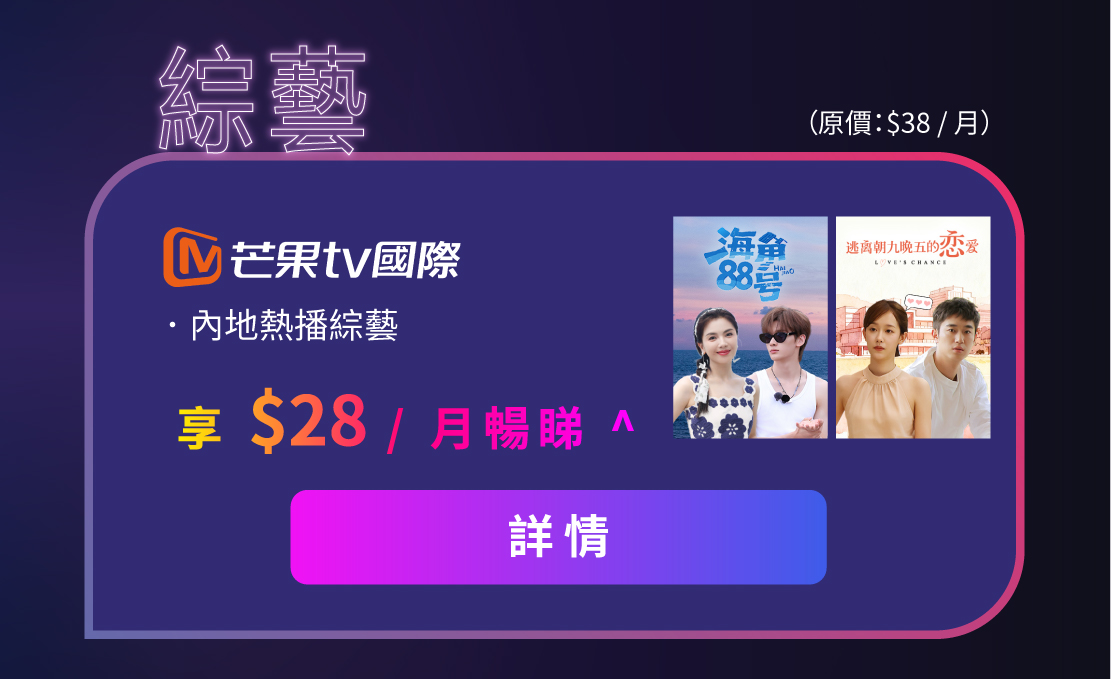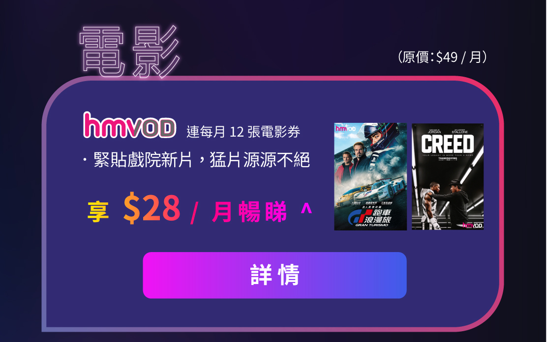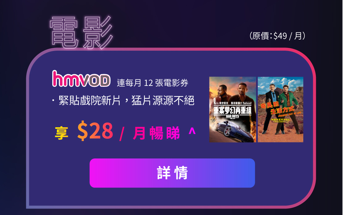^ 此優惠只適用於新申請 Home Media 娛樂服務 - 芒果 TV 國際至尊服務 / Blacknut 雲遊戲 / hmvod 服務之流動電話月費 / 光纖寬頻計劃客戶,且每個娛樂服務均以 $28 / 月計算。首 12 個月優惠期後,如客戶繼續使用相關服務,將以原優惠月費 (芒果 TV $38, Blacknut $60,hmvod $38) 於賬單內收取。