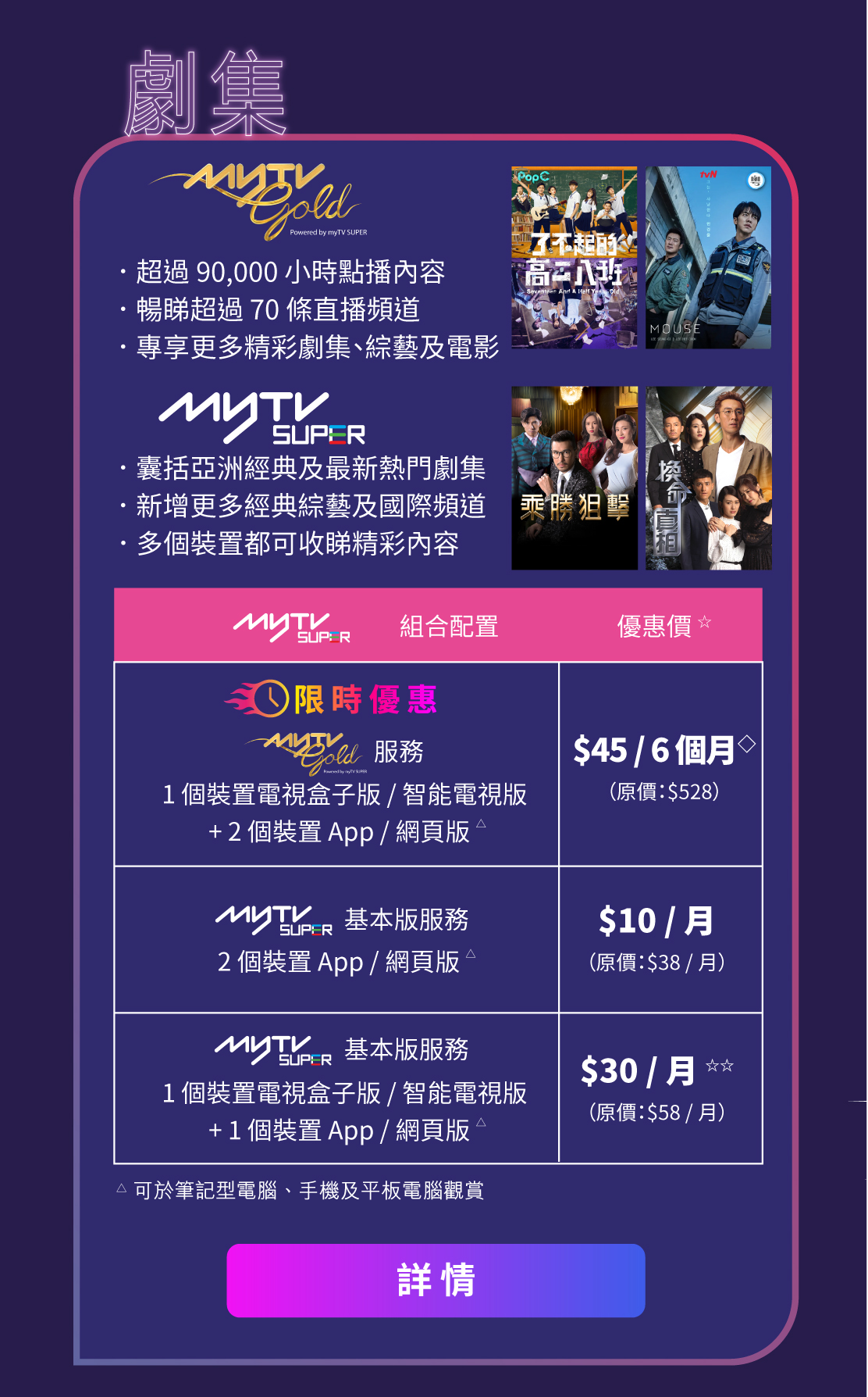 ◇ 流動電話 / 居家光纖寬頻客戶可於 2026 年 3 月 31 日前,享優惠價 $45 購買 6 個月 Home Media 娛樂服務 – myTV Gold 服務(1 個裝置電視盒子版 / 智能電視版 + 2 個裝置 App / 網頁版)。優惠期後,若客戶繼續使用相關服務,將以優惠月費 $58 /月(原價:$88 / 月)於賬單內自動收取。