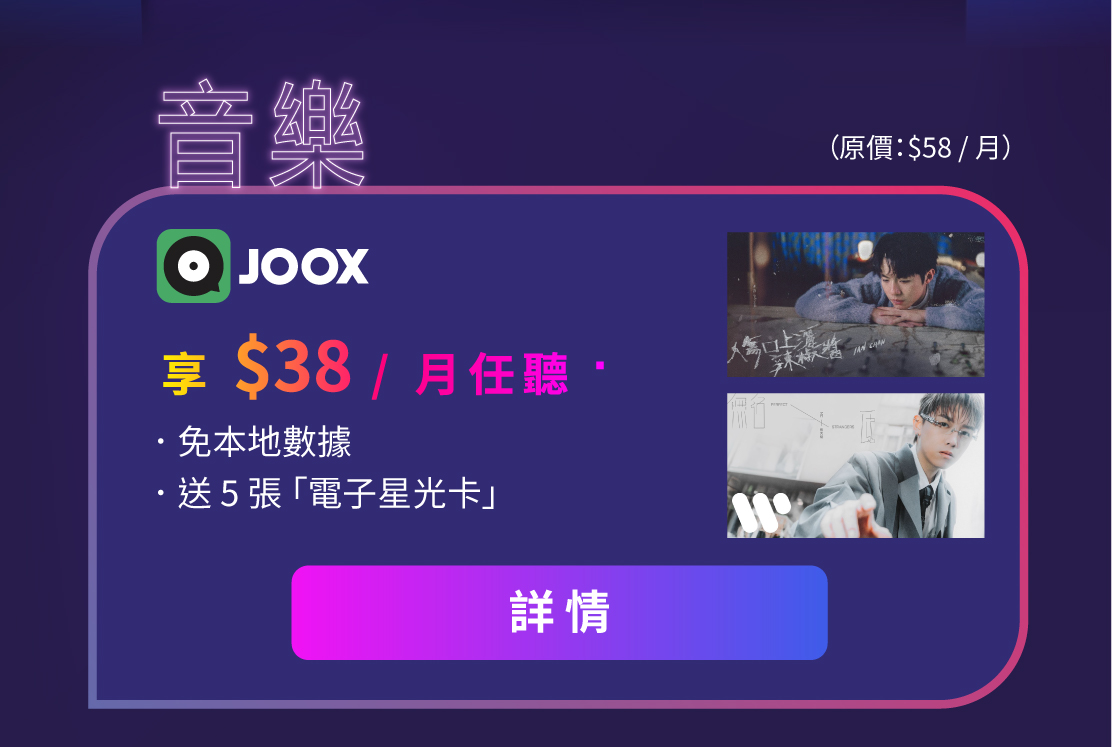 ▪ 此優惠只適用於新申請 Home Media 娛樂服務 – JOOX 服務之流動電話月費客戶。首 3 個月優惠期後,若客戶繼續使用相關服務,將以優惠月費 $48 / 月(原價:$58 / 月)於賬單內自動收取。活動期間,每名新訂閱 Home Media 娛樂服務 - JOOX 服務之客戶可獲 5 張指定「電子星光卡」,數量有限,先到先得,額滿即止。