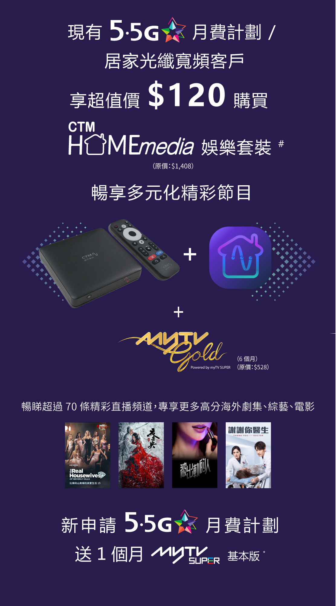 ☆ 此優惠只適用於新申請 Home Media 娛樂服務 - myTV SUPER / myTV Gold 服務 之 5.5G (5G-A) 月費計劃客戶。