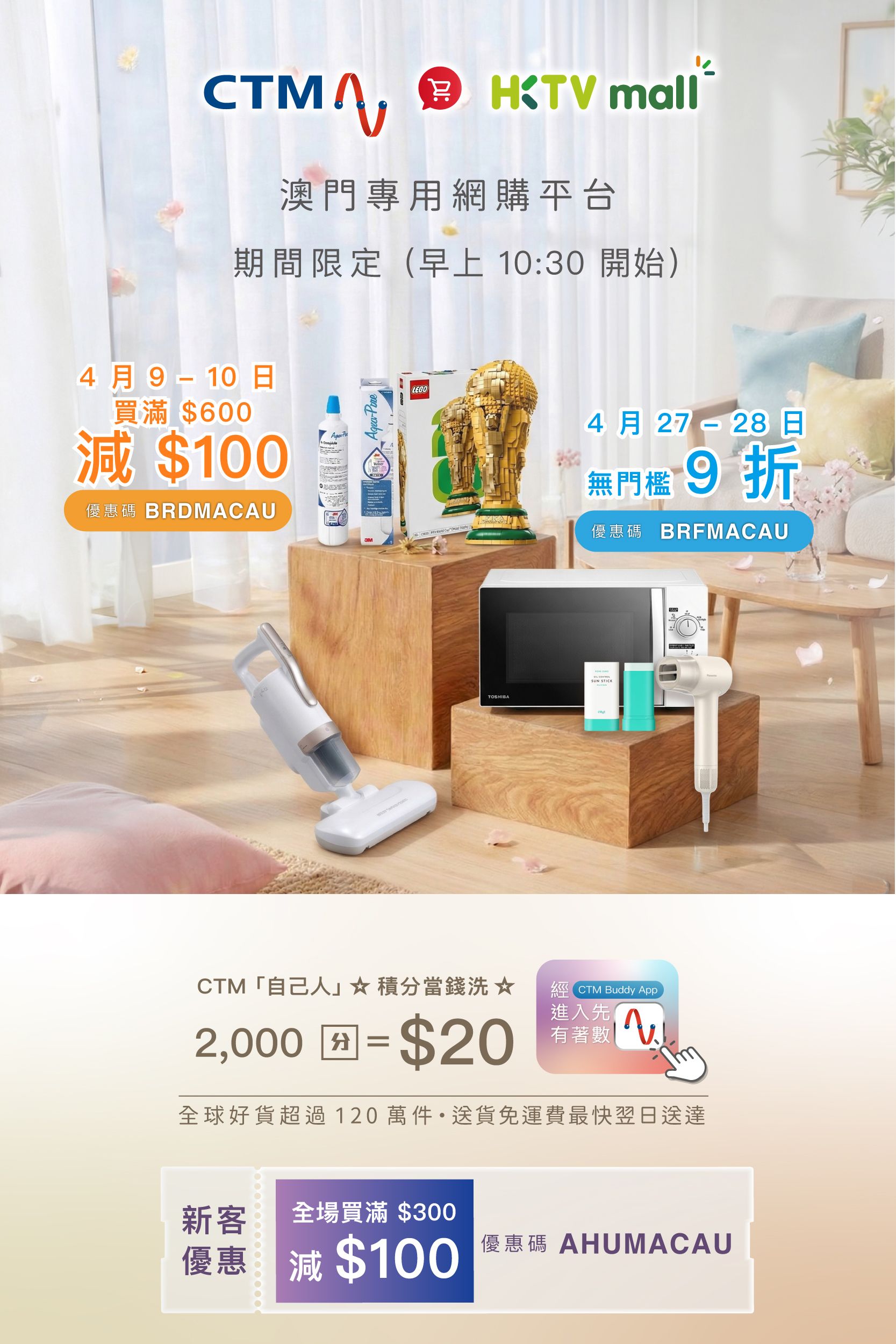 - 活動推廣期由 2026 年 4 月 1 日起至 4 月 30日。- 單一訂單買滿 MOP 200(運費除外)即可享受積分當錢洗優惠。- 積分優惠之金額是以整張訂單計算,已使用之積分及享受之優惠金額不設退款並不可轉讓,且不得兌換現金、現金券或其他貨品。- 每次交易只能使用一次。 - 不可與其他 CTM 優惠同時使用。 - 優惠數量有限,換完即止。