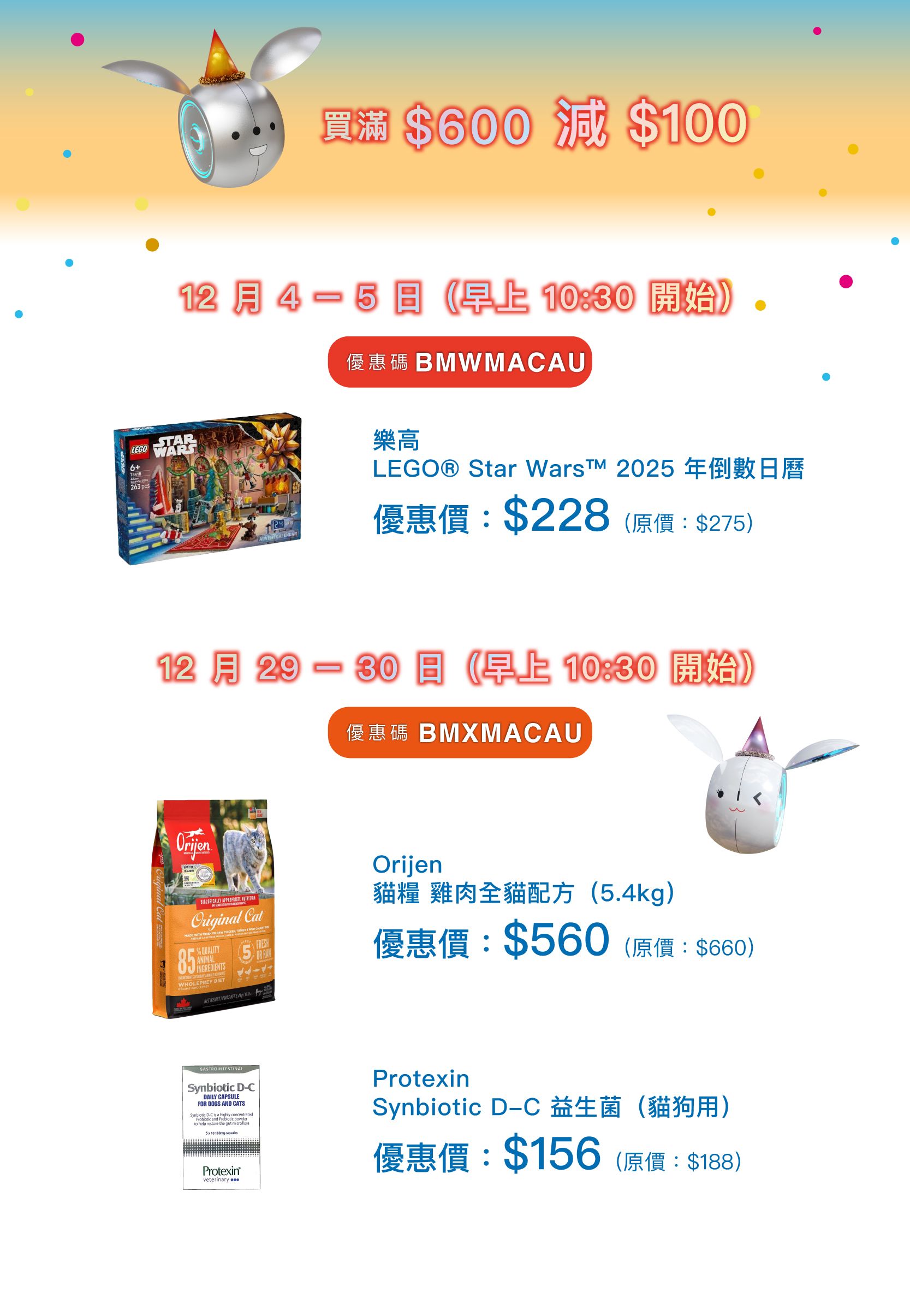 - 單一訂單購買滿 $600,使用優惠碼【BMWMACAU】及【BMXMACAU】可享 $100 優惠,每個帳戶只於每個優惠日子只可使用一次。