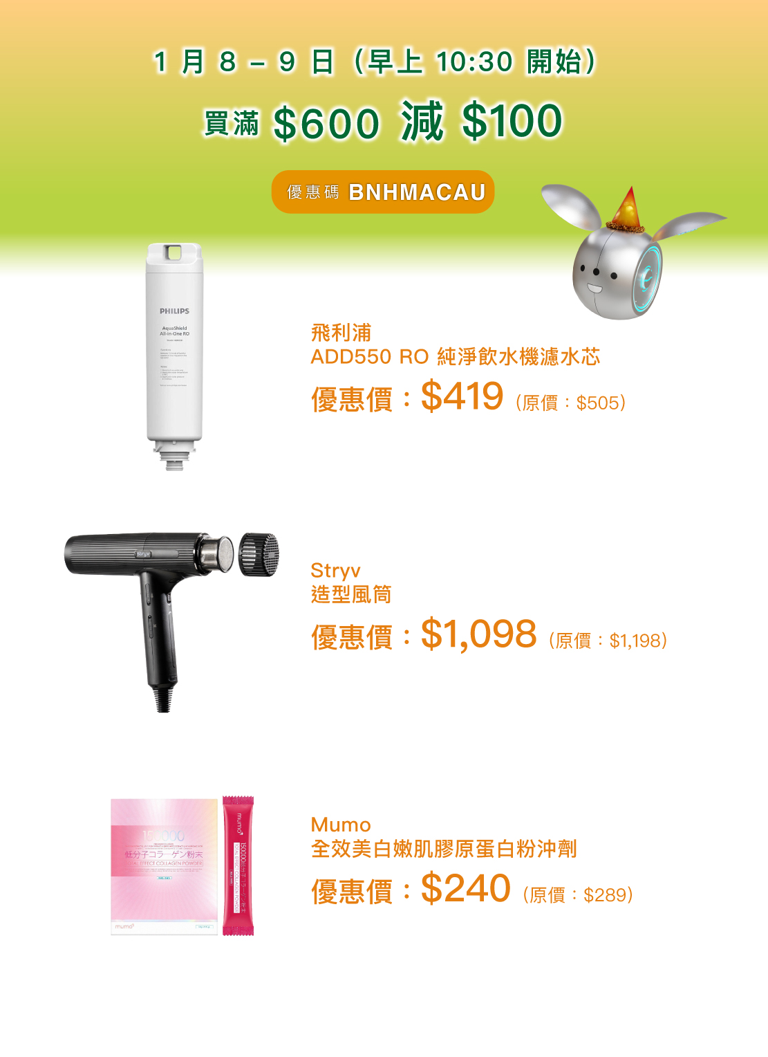 - 單一訂單購買滿 $600,使用優惠碼【BNHMACAU】可享 $100 優惠,每個帳戶只於每個優惠日子只可使用一次。