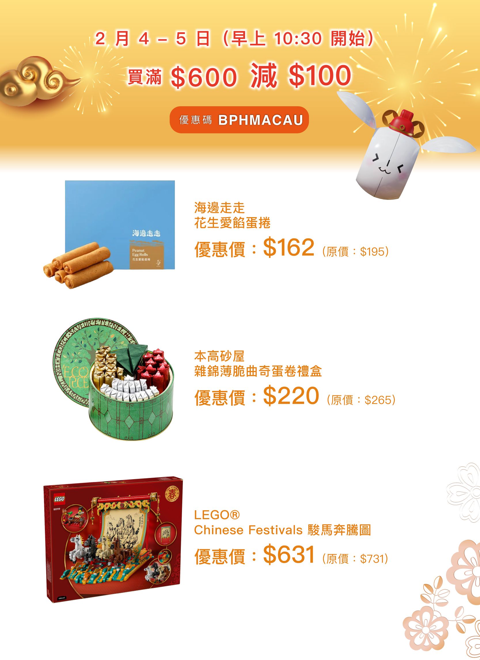 - 單一訂單購買滿 $600,使用優惠碼【BPHMACAU】可享 $100 優惠,每個帳戶只於每個優惠日子只可使用一次。